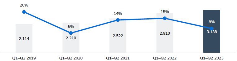 | 百万欧元 | 2023年第一季度–第二季度 | 2022年第一季度–第二季度 | TERM0% | |||