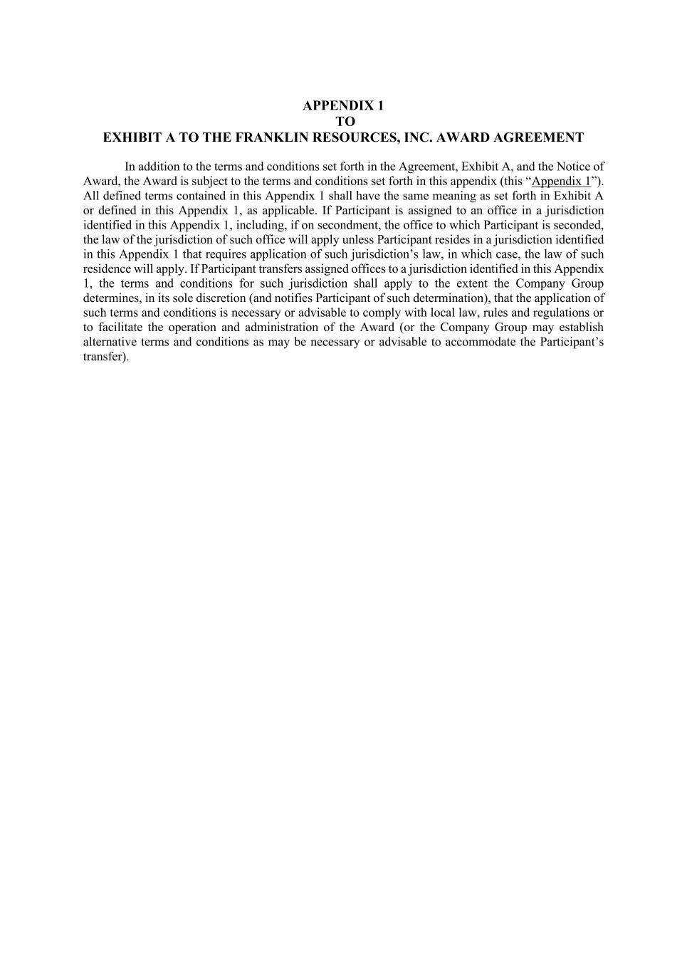 附录1将向富兰克林资源公司展览A。授予协议除协议、附件 A和授予通知中规定的条款和条件外,授予受本附录(此“附录1”)中规定的条款和条件的约束。本附录1所载的所有已定义术语应具有与附件 A中所述或本附录1中所定义(如适用)相同的含义。如果参与者被分配到本附录1中确定的司法管辖区的某个职位,包括如果借调时,参与者被借调到的职位,则将适用该职位的司法管辖区法律,除非参与者居住在本附录1中确定的需要适用该司法管辖区法律的司法管辖区,在这种情况下,将适用该住所的法律。如果参与者将所分配的办公室转移到本附录1中确定的司法管辖区,则该司法管辖区的条款和条件应适用于公司集团全权酌情确定(并将该确定通知参与者)适用该等条款和条件是必要或可取的,以符合当地法律、规则和条例或促进裁决的运作和管理(或公司集团可制定可能必要或可取的替代条款和条件以适应参与者的转移)。