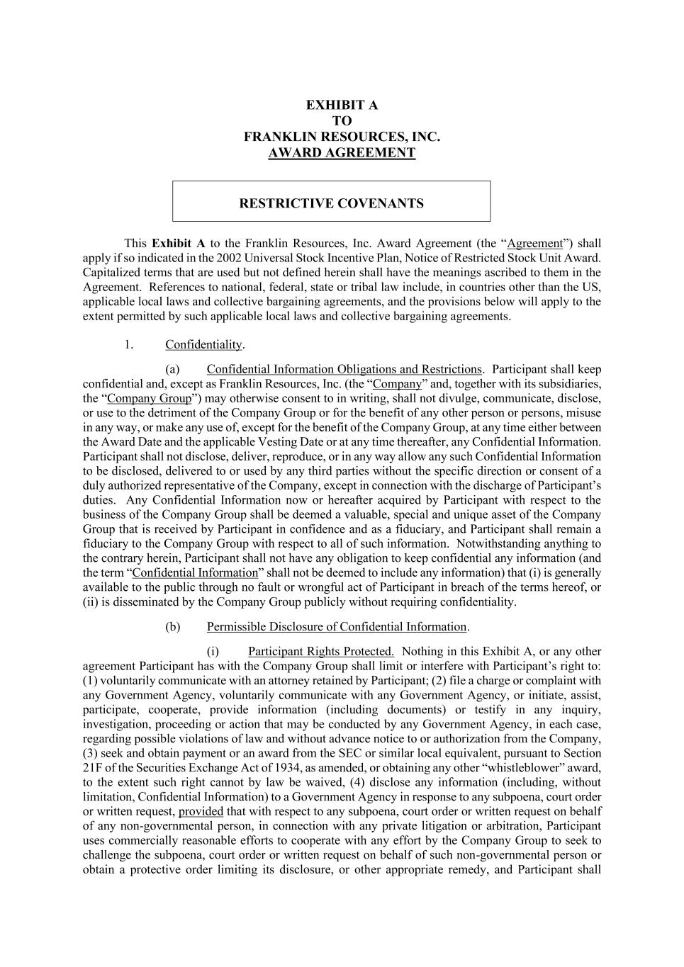 展览A至富兰克林资源公司。授予协议限制性盟约这份与富兰克林资源公司授予协议(“协议”)相关的附件 A,如在2002年普世股票激励计划、限制性股票授予通知中注明,则适用。此处使用但未定义的大写术语应具有协议中赋予它们的含义。对国家、联邦、州或部落法律的提及,在美国以外的国家,包括适用的当地法律和集体谈判协议,以下规定将在此类适用的当地法律和集体谈判协议允许的范围内适用。1.保密。(a)保密信息义务和限制。参与者应予保密,且除富兰克林资源公司(“公司”,连同其附属公司,“公司集团”)可能另行书面同意外,不得在授予日至适用归属日之间的任何时间或其后的任何时间以任何方式泄露、传达、披露或使用任何机密信息,以损害公司集团或为任何其他人或人的利益、以任何方式滥用或作出任何使用(为公司集团的利益除外)。未经公司正式授权代表的具体指示或同意,参与者不得披露、交付、复制或以任何方式允许任何第三方披露、交付或使用任何此类机密信息,除非与参与者履行职责有关。参与者现在或以后获得的与公司集团业务有关的任何机密信息,应被视为参与者以保密方式和作为受托人收到的公司集团的宝贵、特殊和独特的资产,参与者应就所有此类信息保持为公司集团的受托人。尽管有任何与本协议相反的规定,参与者没有任何义务对(i)由于参与者没有违反本协议条款的过错或不法行为而普遍可供公众查阅的任何信息(且“机密信息”一词不应被视为包括任何信息)进行保密,或(ii)由公司集团公开传播而无需保密。(b)允许披露机密信息。(i)受保护的参与者权利。本附件 A或参与者与公司集团订立的任何其他协议中的任何内容均不得限制或干预参与者的权利:(1)自愿与参与者聘请的律师沟通;(2)向任何政府机构提出指控或投诉,自愿与任何政府机构沟通,或在任何政府机构可能进行的任何询问、调查、程序或行动中发起、协助、参与、合作、提供信息(包括文件)或作证,在每种情况下,就可能存在的违法行为,且无需事先通知公司或获得公司授权,(3)根据经修订的1934年《证券交易法》第21F条,寻求并获得SEC或类似的当地同等机构的付款或裁决,或获得任何其他“举报人”裁决,前提是该权利在法律上不能被放弃,(4)为响应任何传票、法院命令或书面请求而向政府机构披露任何信息(包括但不限于机密信息),前提是就任何传票、法院命令或代表任何非政府人士的书面请求而言,与任何私人诉讼或仲裁有关,参与者使用商业上合理的努力来配合公司的任何努力,以代表该非政府人士寻求对传票、法院命令或书面请求提出质疑或获得限制其披露的保护令,或其他适当的补救措施,参与者应