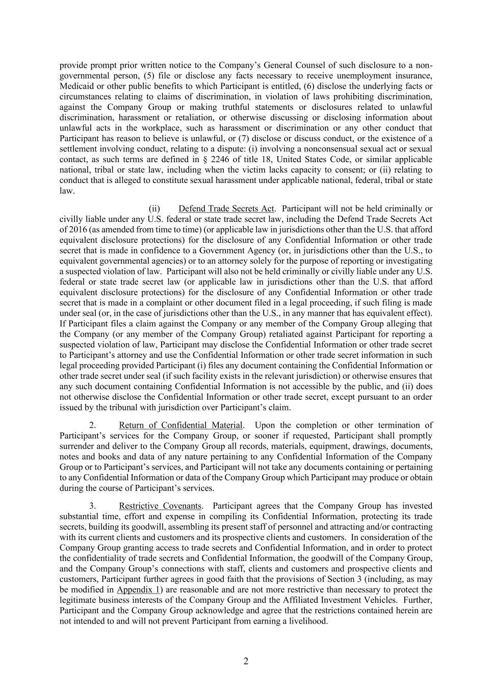 2向公司总法律顾问迅速提前书面通知向非政府人士披露此类信息,(5)提交或披露为领取失业保险、医疗补助或参与者有权获得的其他公共福利所必需的任何事实,(6)披露与歧视索赔有关的基本事实或情况,违反禁止歧视的法律,针对公司集团或作出与非法歧视、骚扰或报复有关的如实陈述或披露,或以其他方式讨论或披露有关工作场所非法行为的信息,例如骚扰或歧视或参与者有理由认为是非法的任何其他行为,或(7)披露或讨论与争端有关的行为,或存在涉及行为的和解:(i)涉及非自愿的性行为或性接触,这些术语在美国法典第18篇第2246条中定义,或类似的适用的国家、部落或州法律中,包括当受害者缺乏同意能力时;或(ii)与根据适用的国家、联邦、部落或州法律被指控构成性骚扰的行为有关。(二)《捍卫商业秘密法》。根据任何美国联邦或州商业秘密法,包括2016年《捍卫商业秘密法》(不时修订)(或美国以外提供同等披露保护的司法管辖区的适用法律),参与者将不会被追究仅为报告或调查涉嫌违法行为而向政府机构(或在美国以外的司法管辖区向同等政府机构)或向律师秘密披露任何机密信息或其他商业秘密的刑事或民事责任。根据任何美国联邦或州商业秘密法(或提供同等披露保护的美国以外司法管辖区的适用法律),如果在法律程序中提交的投诉或其他文件中披露的任何机密信息或其他商业秘密,参与者也不会被追究刑事或民事责任,如果此类提交是在盖章的情况下(或者,在美国以外司法管辖区的情况下,以具有同等效力的任何方式)。如果参与者向公司或公司集团的任何成员提出索赔,声称公司(或公司集团的任何成员)因报告涉嫌违法行为而对参与者进行报复,参与者可以向参与者的代理律师披露机密信息或其他商业秘密,并在此类法律程序中使用机密信息或其他商业秘密信息,前提是参与者(i)将任何包含机密信息或其他商业秘密的文件归档并加盖印章(如果相关司法管辖区存在此类设施)或以其他方式确保任何包含机密信息的此类文件不被公众访问,以及(ii)不以其他方式披露机密信息或其他商业秘密,除非根据对参与者的索赔有管辖权的法庭发布的命令。2.退回机密材料。在参与者为公司集团提供的服务完成或以其他方式终止时,或如有要求,则在此之前,参与者应立即向公司集团交出并交付与公司集团的任何机密信息或与参与者的服务有关的所有记录、材料、设备、图纸、文件、笔记和簿册及任何性质的数据,且参与者不会采取任何包含或与参与者在参与者服务过程中可能出示或获得的公司集团的任何机密信息或数据有关的文件。3.限制性盟约。参与者同意,公司集团已投入大量时间、精力和费用,以汇编其机密信息、保护其商业秘密、建立其商誉、集结其现有人员以及吸引和/或与其现有客户和客户及其潜在客户和客户订立合同。考虑到公司集团授予对商业秘密和机密信息的访问权限,并且为了保护商业秘密和机密信息的机密性、公司集团的商誉以及公司集团与员工、客户和客户以及潜在客户和客户的联系,参与者进一步善意地同意,第3节的规定(包括可能在附录1中进行修改的规定)是合理的,并且对于保护公司集团和关联投资载体的合法商业利益没有超过必要的限制性。此外, 参与者和公司集团承认并同意,此处包含的限制并非旨在也不会阻止参与者谋生。