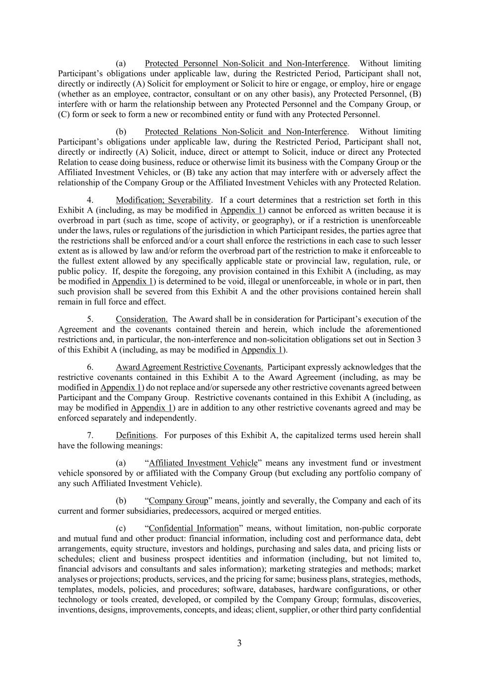 3(a)受保护人员不招揽和不干涉。在不限制参与者根据适用法律承担的义务的情况下,在限制期内,参与者不得直接或间接(a)招揽雇用或招揽雇用或聘用,或雇用、雇用或聘用(不论是作为雇员、承包商、顾问或任何其他基础)任何受保护人员,(b)干预或损害任何受保护人员与公司集团之间的关系,或(c)与任何受保护人员形成或寻求组建新的或重组的实体或基金。(b)受保护的关系非请求和不干涉。在不限制参与者在适用法律下的义务的情况下,在限制期内,参与者不得直接或间接(a)招揽、诱导、指示或试图招揽、诱导或指示任何受保护关系停止与公司集团或关联投资载体开展业务、减少或以其他方式限制其与公司集团或关联投资载体的业务,或(b)采取任何可能干扰或对公司集团或关联投资载体与任何受保护关系的关系产生不利影响的行动。4.改性;可分割性。如果法院判定本附件 A中规定的限制(包括可能在附录1中修改的)不能按书面形式强制执行,因为该限制在一定程度上过于宽泛(例如时间、活动范围或地理位置),或者根据参与者居住的司法管辖区的法律、规则或条例,该限制不可执行,各方同意,应强制执行限制和/或法院应在法律允许的较小程度上强制执行每种情况下的限制和/或改革限制的过于宽泛的部分,使其在任何具体适用的州或省法律、法规、规则或公共政策允许的最大范围内可强制执行。如果尽管有上述规定,本附件 A(包括可能在附录1中修改的)所载的任何规定被确定为全部或部分无效、非法或不可执行,则该规定应与本附件 A分离,本规定所载的其他规定仍然完全有效。5.考虑。该裁决应考虑到参与者执行协议以及其中和本协议所载的契约,其中包括上述限制,特别是本附件 A第3节(包括可能在附录1中修改的)中规定的不干涉和不招揽义务。6.授标协议限制性契约。参与者明确承认,授予协议本附件 A所载的限制性契诺(包括可能在附录1中修改的)并不取代和/或取代参与者与公司集团之间商定的任何其他限制性契诺。本附件 A所载的限制性契诺(包括可能在附录1中修改的)是对所同意的任何其他限制性契诺的补充,可以单独和独立地强制执行。7.定义。就本附件 A而言,此处使用的大写术语应具有以下含义:(a)“关联投资工具”是指由公司集团(但不包括任何该等关联投资工具的任何投资组合公司)赞助或关联的任何投资基金或投资工具。(b)“公司集团”是指公司及其现有和以前的子公司、前身、被收购或合并的实体共同或个别地。(三)“保密信息”是指,但不限于非公有制企业和共同基金及其他产品:财务信息,包括成本和绩效数据、债务安排、股权结构、投资者和持股、采购和销售数据以及定价清单或时间表;客户和业务前景身份和信息(包括但不限于财务顾问和顾问以及销售信息);营销策略和方法;市场分析或预测;产品、服务及其定价;业务计划、策略、方法、模板、模型、政策和程序;软件、数据库、硬件配置或公司集团创建、开发或汇编的其他技术或工具;公式,发现、发明、设计、改进、概念和想法;客户、供应商或其他第三方保密