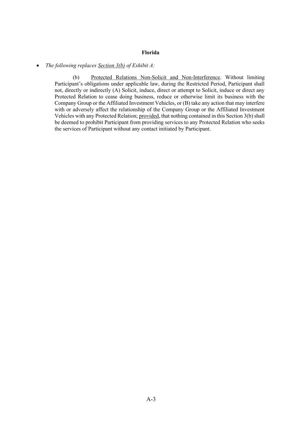 A-3佛罗里达•以下取代附件 A的第3节(b):(b)受保护的关系非请求和不干涉。在不限制参与者在适用法律下的义务的情况下,在限制期内,参与者不得直接或间接(a)招揽、诱导、指示或试图招揽、诱导或指示任何受保护关系停止与公司集团或关联投资载体开展业务、减少或以其他方式限制其与公司集团或关联投资载体的业务,或(b)采取任何可能干扰或对公司集团或关联投资载体与任何受保护关系的关系产生不利影响的行动;但,本条第3(b)条所载的任何规定,不得当作禁止参与者向任何寻求参与者服务而无需由参与者发起任何接触的受保护关系提供服务。