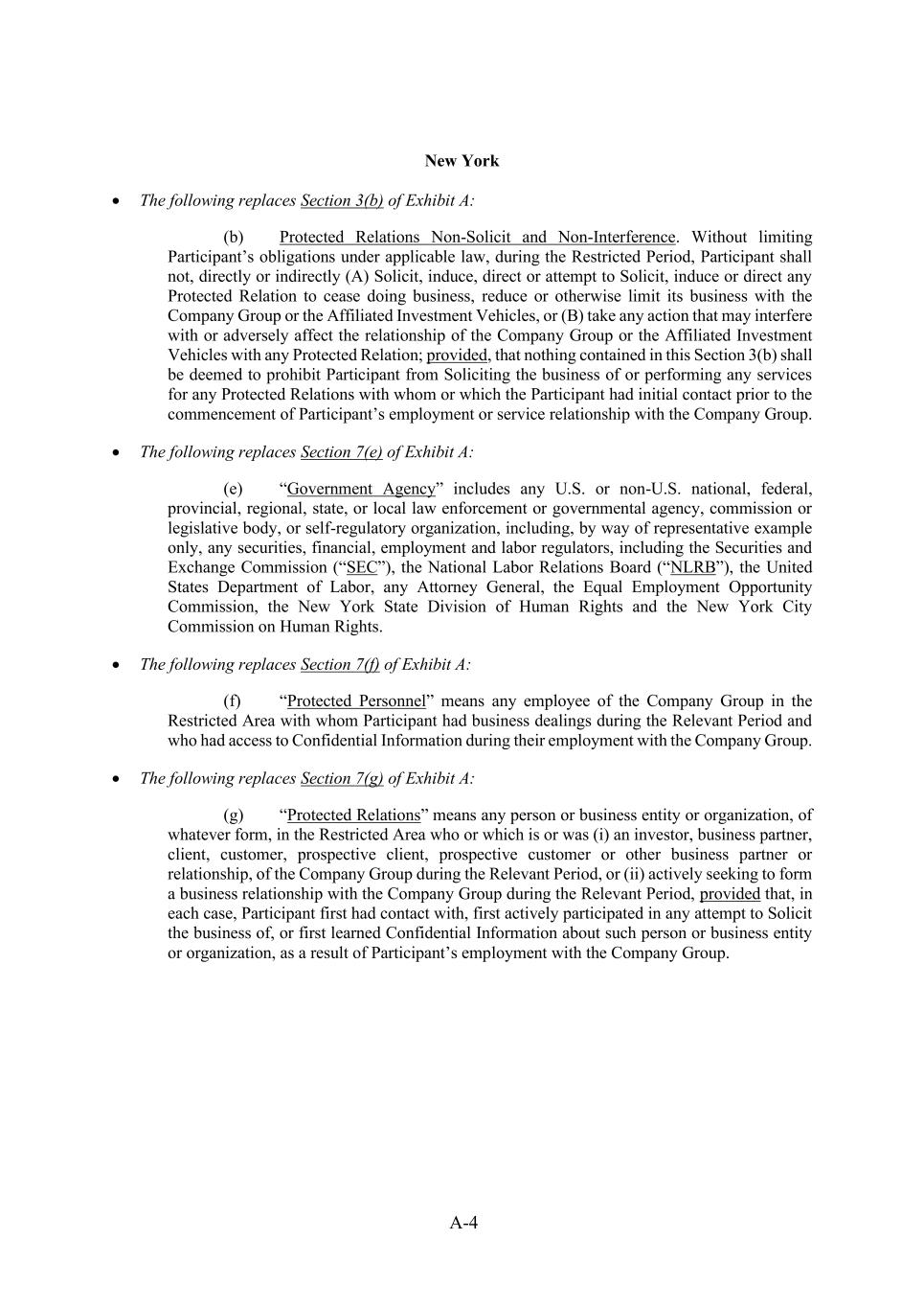 A-4纽约•以下取代附件 A的第3节(b):(b)受保护的关系非请求和不干涉。在不限制参与者在适用法律下的义务的情况下,在限制期内,参与者不得直接或间接(a)招揽、诱导、指示或试图招揽、诱导或指示任何受保护关系停止与公司集团或关联投资载体开展业务、减少或以其他方式限制其与公司集团或关联投资载体开展的业务,或(b)采取任何可能干扰或对公司集团或关联投资载体与任何受保护关系的关系产生不利影响的行动;但,本第3(b)条所载的任何规定,不得当作禁止参与者为任何受保护关系招揽业务或执行任何服务,而该参与者在参与者与公司集团的雇佣或服务关系开始前与谁或与谁有初步接触。•以下内容取代附件 A的第7(e)节:(e)“政府机构”包括任何美国或非美国的国家、联邦、省、地区、州或地方执法或政府机构、委员会或立法机构或自律组织,包括(仅作为代表示例)任何证券、金融、就业和劳工监管机构,包括美国证券交易委员会(“SEC”)、国家劳资关系委员会(“NLRB”)、美国劳工部、任何司法部长、平等就业机会委员会、纽约州人权司和纽约市人权委员会。•以下内容取代附件 A第7(f)节:(f)“受保护人员”是指公司集团在限制区内的任何雇员,参与者在相关期间与其有业务往来,并且在其受雇于公司集团期间有权访问机密信息。•以下各项取代附件 A第7(g)节:(g)“受保护关系”指在限制区内的任何个人或业务实体或组织,不论其形式为何,其(i)在相关期间是或曾经是公司集团的投资者、业务伙伴、客户、客户、潜在客户、潜在客户或其他业务伙伴或关系,或(ii)在相关期间积极寻求与公司集团形成业务关系,但在每种情况下,参与者首先接触、首先积极参与任何试图招揽的业务,或由于参与者受雇于公司集团而首先获悉有关该个人或业务实体或组织的机密信息。
