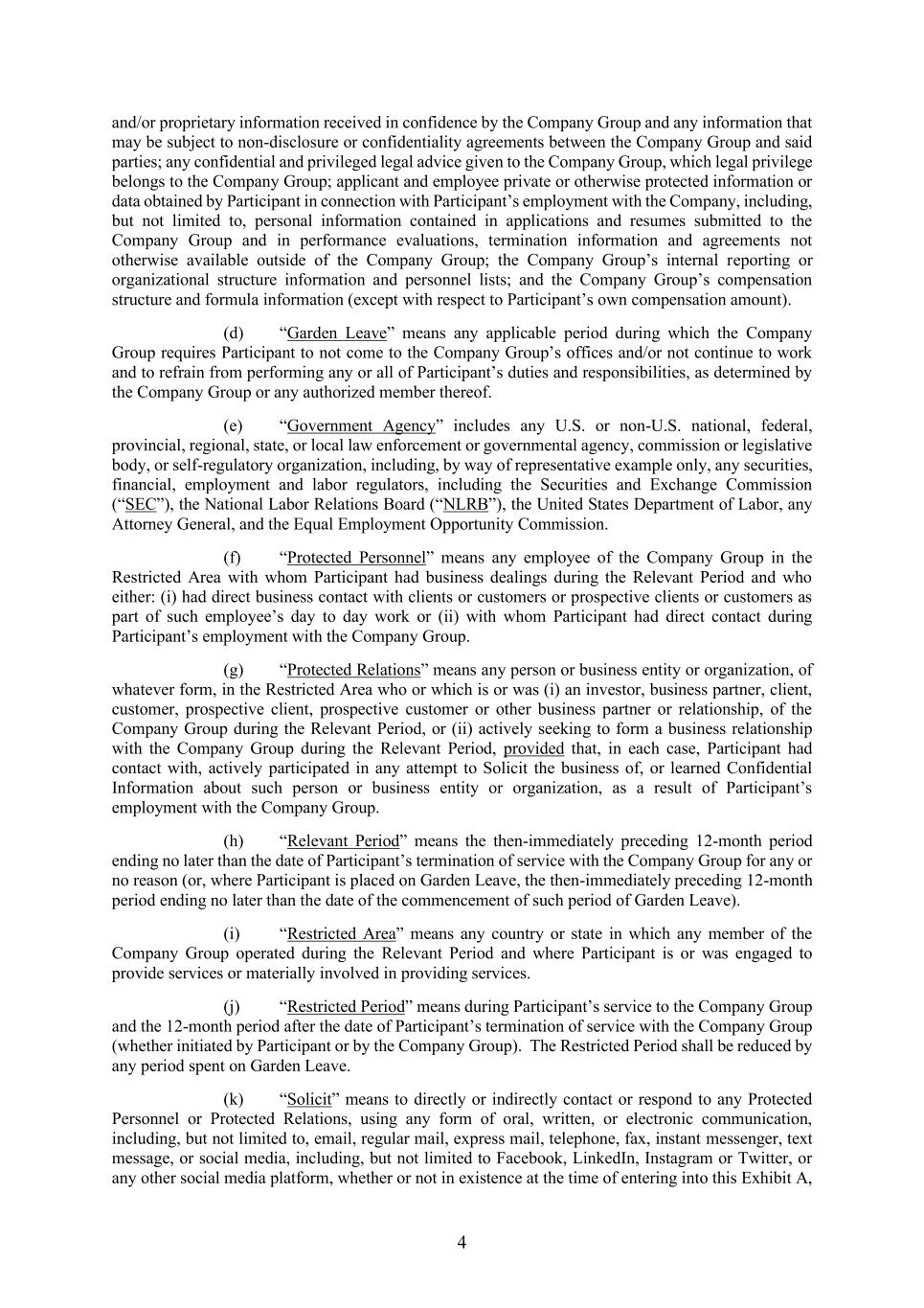 公司集团以保密方式收到的4项和/或专有信息,以及公司集团与上述各方之间可能受保密或保密协议约束的任何信息;给予公司集团的任何保密和特权法律建议,该法律特权属于公司集团;申请人和雇员因参与者受雇于公司而获得的私人或其他受保护的信息或数据,包括但不限于提交给公司集团的申请和简历以及绩效评估中包含的个人信息,公司集团以外无法获得的终止信息和协议;公司集团的内部报告或组织结构信息和人员名单;公司集团的补偿结构和公式信息(参与者自己的补偿金额除外)。(d)“休假”指公司集团要求参与者不得来到公司集团的办公室和/或不继续工作以及不履行公司集团或其任何授权成员确定的任何或所有参与者的职责和责任的任何适用期间。(e)“政府机构”包括任何美国或非美国国家、联邦、省、地区、州或地方执法机构或政府机构、委员会或立法机构,或自律组织,仅通过代表示例的方式,包括任何证券、金融、就业和劳工监管机构,包括美国证券交易委员会(“SEC”)、国家劳资关系委员会(“NLRB”)、美国劳工部、任何司法部长和平等就业机会委员会。(f)「受保护人员」指公司集团在有关期间与参与者有业务往来的任何位于限制区的雇员,而该雇员:(i)作为该雇员日常工作的一部分与客户或客户或潜在客户或客户有直接业务联系,或(ii)参与者在公司集团受雇期间与其有直接联系。(g)“受保护关系”指在限制区内的任何个人或商业实体或组织,无论其形式如何,其(i)在有关期间是或曾经是公司集团的投资者、业务伙伴、客户、客户、潜在客户、潜在客户或其他商业伙伴或关系,或(ii)在有关期间积极寻求与公司集团形成业务关系,但在每种情况下,参与者与该个人或商业实体或组织接触、积极参与任何试图征求其业务的尝试,或获悉有关该个人或商业实体或组织的机密信息,由于参与者受雇于公司集团。(h)「有关期间」指不迟于参与者因任何理由或无理由而终止在公司集团服务的日期(或如参与者被安排休园假,则指不迟于该等休园假开始日期结束的紧接前12个月期间)的紧接期前12个月期间。(i)“限制区”指公司集团的任何成员在有关期间经营的任何国家或州,以及参与者正在或曾经受聘提供服务或实质上参与提供服务的任何国家或州。(j)“限制期”指参与者向公司集团提供服务期间以及参与者终止向公司集团提供服务之日后的12个月期间(无论是由参与者发起还是由公司集团发起)。限制期应减去休园假的任何期间。(k)“征集”是指使用任何形式的口头、书面或电子通讯,包括但不限于电子邮件、普通邮件、快件、电话、传真、即时通讯、短信或社交媒体,包括但不限于Facebook、LinkedIn、Instagram或Twitter,或任何其他社交媒体平台,直接或间接联系或回复任何受保护人员或受保护关系人员,无论在订立本附件时是否存在,