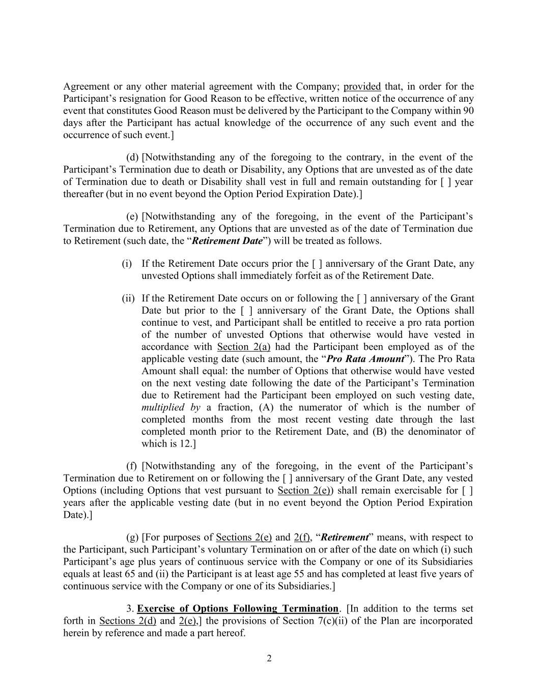 2与公司的协议或任何其他重大协议;但为使参与者因正当理由辞职生效,参与者必须在参与者实际知悉任何该等事件的发生和该等事件的发生后90天内向公司送达构成正当理由的任何事件的书面通知。](d)[尽管有上述任何相反的规定,在参与者因死亡或残疾而被终止的情况下,任何因死亡或残疾而在终止日期未归属的期权应全额归属,并在其后[ ]年内(但在任何情况下均不得超过期权期到期日)未归属。](e)[尽管有上述任何规定,如果参与者因退休而终止,则任何因退休而在终止日期(该日期,“退休日期”)未归属的期权将按以下方式处理。(i)如退休日期发生在授予日的[ ]周年之前,则任何未归属的期权应于退休日期起立即被没收。(ii)如果退休日期发生在授予日的[ ]周年日或之后,但在授予日的[ ]周年日之前,则期权应继续归属,参与者有权获得未归属期权数量的按比例部分,如果该参与者在适用的归属日期被雇用,则该数量本应根据第2(a)条归属(该金额,“按比例金额”)。按比例计算的金额应等于:如果参与者在该归属日受雇于该参与者因退休而终止的日期之后的下一个归属日,否则本应归属的期权数量乘以分数,(a)其分子是从最近的归属日到退休日期之前最后一个完成月的已完成月数,以及(b)其分母为12. ](f)[尽管有上述任何规定,如参与者因在授予日[ ]周年当日或之后退休而终止,则任何既得期权(包括根据第2(e)节归属的期权)应在适用的归属日之后[ ]年内(但在任何情况下均不得超过期权期到期日)。](g)[就第2(e)和2(f)节而言,“退休”是指,就参与者而言,该参与者在(i)该参与者的年龄加上在公司或其子公司之一的连续服务年限至少等于65岁和(ii)该参与者至少55岁并已在公司或其子公司之一完成至少五年的连续服务之日或之后自愿终止。] 3。终止后行使期权。[除了第2(d)和2(e)节中规定的条款外,]该计划第7(c)(ii)节的规定以引用方式并入本文,并成为本文的一部分。