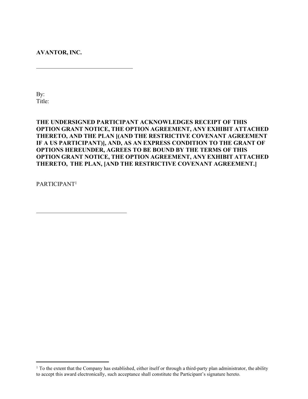 Avantor, Inc.作者:标题:被签署方承认收到本期权授予通知、期权协议、其所附的任何展品、计划[(以及限制性公约协议,如果是美国参与者)],并作为此处授予期权的明示条件,同意受本期权授予通知、期权协议、其所附的任何展品的条款约束此种接受应构成参与者在此签署。