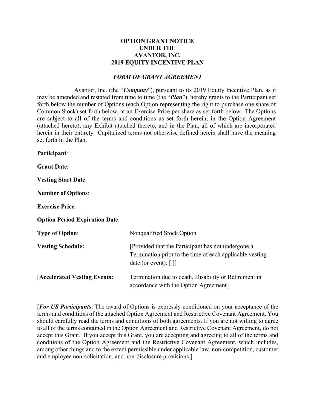 Avantor,INC.下的期权授予通知2019年股权激励计划形式授予协议Avantor, Inc.(“公司”)根据其2019年股权激励计划(可能不时修订和重述)(“计划”),现向参与者授予以下数量的期权(每份期权代表购买一股普通股的权利),行使价如下所述每股。这些期权受本协议、期权协议(随附)、随附的任何附件以及计划中规定的所有条款和条件的约束,所有这些条款和条件均已完整纳入本协议。本文未另行定义的大写术语应具有计划中规定的含义。参与者:授予日:归属起始日:期权数量:行权价格:期权期限到期日:期权类型:不合格股票期权归属时间表:[前提是参与者在每个适用的归属日(或事件)的时间之前没有经历过终止:[ ] ] [加速归属事件:根据期权协议因死亡、残疾或退休而终止] [对于美国参与者:授予期权的明确条件是您接受所附期权协议和限制性契约协议的条款和条件。你应该仔细阅读这两份协议的条款和条件。如果您不愿意同意期权协议和限制性契约协议中包含的所有条款,请不要接受此授予。如阁下接受此项授予,即为接纳及同意期权协议及限制性契约协议的所有条款及条件,其中包括(其中包括)不竞争、客户及雇员不招揽及不披露条款,并在适用法律允许的范围内。]