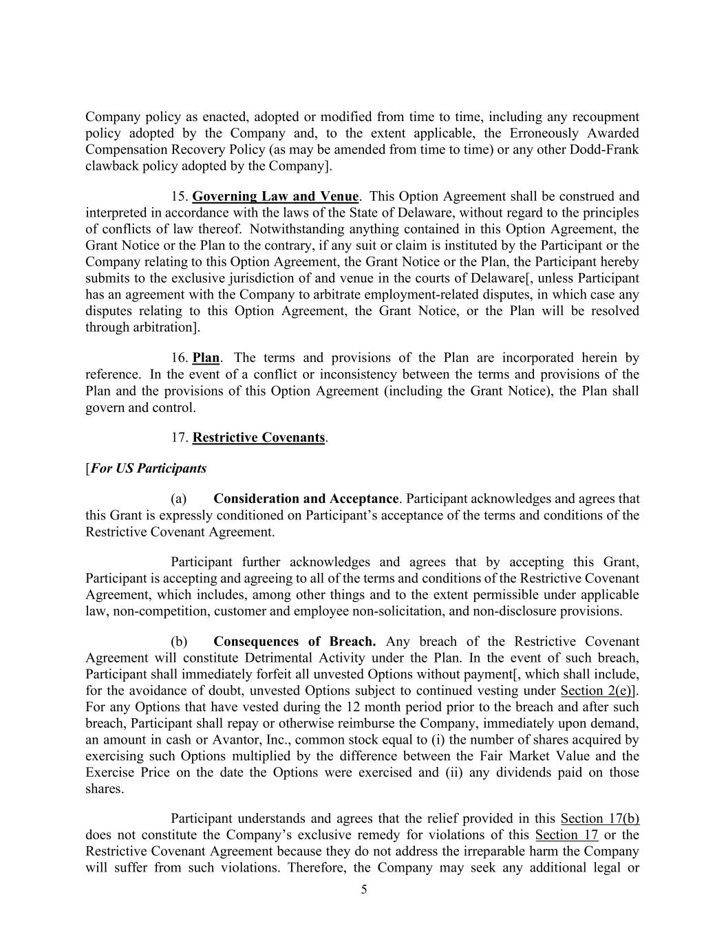 5不时颁布、采纳或修改的公司政策,包括公司采纳的任何补偿政策,以及(在适用范围内)错误授予的补偿补偿政策(可能不时修订)或公司采纳的任何其他多德-弗兰克补偿政策]。15.管辖法律和地点。本期权协议应根据特拉华州法律进行解释和解释,而不考虑其法律冲突原则。尽管本期权协议、授予通知或计划中有任何与之相反的内容,如果参与者或公司就本期权协议、授予通知或计划提起任何诉讼或索赔,参与者特此提交特拉华州法院的专属管辖权和地点[,除非参与者与公司达成协议以仲裁与雇佣相关的争议,在这种情况下,与本期权协议、授予通知或计划有关的任何争议将通过仲裁解决]。16.计划。该计划的条款和规定通过引用并入本文。本计划的条款和规定与本期权协议(包括授予通知)的规定发生冲突或不一致时,由本计划管辖和控制。17.限制性盟约。[对于美国参与者(a)考虑和接受。参与者承认并同意,此项授予明确以参与者接受限制性契约协议的条款和条件为条件。参与者进一步承认并同意,通过接受这项授予,参与者即接受并同意限制性契约协议的所有条款和条件,其中包括(其中包括)在适用法律允许的范围内,不竞争、客户和员工不招揽以及不披露条款。(b)违约后果。任何违反限制性契约协议的行为将构成该计划下的有害活动。如果发生此种违约,参与者应立即没收所有未归属的期权而不支付[,为免生疑问,其中应包括根据第2(e)节继续归属的未归属期权]。对于在违约发生前和违约发生后的12个月期间内已归属的任何期权,参与者应在提出要求后立即以现金或Avantor, Inc.、普通股的形式向公司偿还或以其他方式偿还相当于(i)通过行使此类期权获得的股份数量乘以期权行使之日公允市场价值与行权价格之间的差额,以及(ii)就这些股份支付的任何股息。参与者理解并同意,本第17(b)条提供的救济不构成公司对违反本第17条或限制性公约协议的专属补救措施,因为它们没有解决公司将因此类违规行为而遭受的不可弥补的损害。因此,公司可能会寻求任何额外的法律或