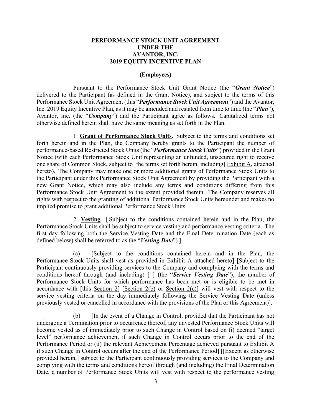 根据向参与者(定义见授予通知)交付的绩效股票单位授予通知(“授予通知”),并在遵守本绩效股票单位协议(本“绩效股票单位协议”)和《Avantor, Inc. 2019年股权激励计划》(因其可能不时修订和重述)(“计划”)的条款的情况下,根据Avantor,INC. 2019年股权激励计划(“员工)项下的3份绩效股票单位协议(“员工),丨Avantor,Inc.(“公司”)与参与者约定如下。本文未另行定义的大写术语应具有计划中所述的相同含义。1.授予业绩股票单位。在遵守本协议和本计划规定的条款和条件的情况下,公司特此向参与者授予授予通知中规定的基于业绩的限制性股票单位(“业绩股票单位”)的数量(每个业绩股票单位代表获得一股普通股的无资金、无担保权利,但须遵守[本协议规定的条款,包括]本协议所附的附件 A)。公司可向参与者提供新的授予通知,根据本业绩股票单位协议向参与者额外授予一项或多项业绩股票单位,该通知还可能包括在其中规定的范围内与本业绩股票单位协议不同的任何条款和条件。本公司保留根据本协议授予额外业绩股票单位的所有权利,并不作出默示承诺授予额外业绩股票单位。2.归属。[在符合本协议及本计划所载条件下,业绩股票单位须遵守服务归属及业绩归属准则。服务归属日期及最终厘定日期(定义见下文)后的第一天,均称为“归属日期”)。】(a)[在符合本协议及计划所载条件的情况下,业绩股票单位应按本协议所附的附件 A的规定归属] [但以参与者透过(且包括)持续向公司提供服务及遵守本协议的条款及条件为限[ ](“服务归属日期”),根据[本第2条] [第2(b)条或第2(c)条]已达到或有资格达到的业绩存量单位的数目将于紧接服务归属日期的翌日就服务归属标准归属(除非先前根据计划或本协议的规定归属或取消)]。(b)【在控制权发生变更的情况下,只要参与者在发生变更之前没有经历过终止,任何未归属的业绩股票单位将在紧接该控制权变更之前根据(i)被视为“目标水平”的业绩实现情况归属,如果该控制权变更发生在履约期结束之前,或(ii)如果该控制权变更发生在履约期结束之后,则根据附件 A实现的相关实现百分比] [ [除此处另有规定外,]取决于参与者通过(包括)最终确定日期持续向公司提供服务并遵守本协议的条款和条件,就业绩归属而言,若干业绩股票单位将归属