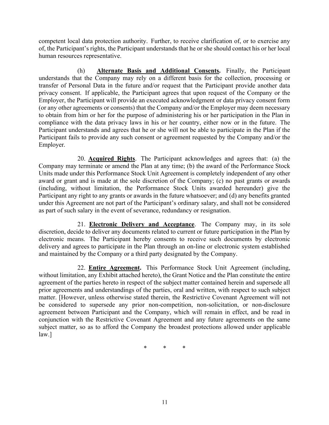 11个地方数据保护主管部门。此外,要获得对参与者权利的澄清或行使其中任何一项权利,参与者理解应联系其当地人力资源代表。(h)备用基础和额外同意。最后,参与者理解,公司未来可能会依赖不同的基础来收集、处理或转移个人数据和/或要求参与者提供另一份数据隐私同意书。如适用,参与者同意,应公司或雇主的请求,参与者将提供公司和/或雇主可能认为有必要从他或她处获得的已签署的确认或数据隐私同意书(或任何其他协议或同意),以便在现在或将来按照其本国的数据隐私法管理其参与计划。参与者理解并同意,如果参与者未能提供公司和/或雇主要求的任何此类同意或协议,他或她将无法参与该计划。20.获得的权利。参与者承认并同意:(a)公司可随时终止或修订该计划;(b)根据本绩效股票单位协议作出的绩效股票单位的授予完全独立于任何其他奖励或授予,并由公司全权酌情作出;(c)过去的任何授予或奖励(包括但不限于根据本协议授予的绩效股票单位)均未赋予参与者任何未来获得任何授予或奖励的权利;以及(d)根据本协议授予的任何福利不属于参与者的普通工资,在发生离职、裁员或辞职时,不应被视为此类工资的一部分。21.电子交付和验收。公司可全权酌情决定以电子方式交付与当前或未来参与该计划有关的任何文件。参与者特此同意以电子交付方式接收此类文件,并同意通过公司或公司指定的第三方建立和维护的在线或电子系统参与该计划。22.全部协议。本业绩股票单位协议(包括但不限于随附的任何附件)、授予通知和计划构成本协议各方就本协议所载标的事项达成的全部协议,并取代各方先前就该标的事项达成的所有口头和书面协议和谅解。【然而,除非其中另有说明,限制性契约协议将不会被视为取代参与者与公司之间的任何先前不竞争、不招揽或不披露协议,该协议将继续有效,并与限制性契约协议和任何未来关于同一标的的协议一并解读,从而为公司提供适用法律允许的最广泛的保护。】***