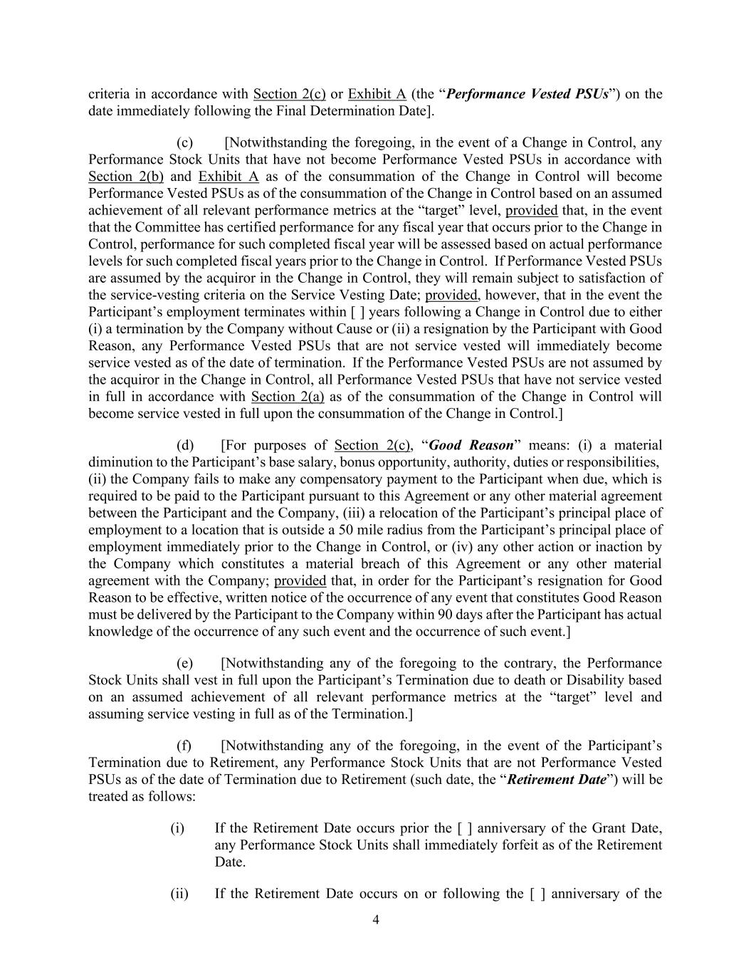 4项标准,在紧接最终确定日期之后的日期,按照第2节(c)或附件 A(“业绩归属PSU”)]。(c)[尽管有上述规定,在控制权发生变更的情况下,截至控制权变更完成时尚未根据第2(b)节和附件 A成为业绩归属PSU的任何业绩股票单位,将在控制权变更完成时根据假定在“目标”级别实现所有相关业绩指标而成为业绩归属PSU,但前提是,如果委员会已证明控制权变更之前发生的任何财政年度的业绩,该已完成财政年度的业绩将根据控制权变更前该已完成财政年度的实际业绩水平进行评估。如果业绩归属的PSU在控制权变更中由收购方承担,则它们仍将受制于在服务归属日期满足服务归属标准;但前提是,如果参与者的雇佣在控制权变更后[ ]年内因(i)公司无故终止或(ii)参与者有充分理由辞职而终止,则任何未获得服务的业绩归属的PSU将在终止之日立即成为服务归属。如果业绩归属PSU不是由控制权变更中的收购方承担,则截至控制权变更完成时尚未按照第2(a)节全额授予服务的所有业绩归属PSU将在控制权变更完成时成为全额授予服务。](d)[就第2(c)节而言,“正当理由”是指:(i)大幅减少参与者的基本工资、奖金机会、权力、职责或责任,(ii)公司未能在到期时向参与者支付任何补偿性款项,根据本协议或参与者与公司之间的任何其他重大协议须向参与者支付的款项,(iii)将参与者的主要工作地点搬迁至紧接控制权变更前参与者的主要工作地点方圆50英里以外的地点,或(iv)公司构成严重违反本协议或与公司的任何其他重大协议的任何其他作为或不作为;但为使参与者因正当理由辞职生效,任何构成正当理由的事件的发生的书面通知必须由参与者在参与者实际知悉任何该等事件的发生和该等事件的发生后的90天内送达公司。](e)[尽管有上述任何相反的规定,业绩股票单位应在参与者因死亡或残疾而终止时根据假定在“目标”级别实现所有相关业绩指标并承担截至终止时全部服务归属时全部归属。](f)[尽管有上述任何规定,在参与者因退休而终止的情况下,截至因退休而终止之日(该日期,“退休日期”)不属于业绩归属PSU的任何业绩股票单位将按以下方式处理:(i)如果退休日期发生在授予日期的[ ]周年之前,则任何业绩股票单位应自退休日期起立即被没收。(二)如果退休日期发生在第[ ]个周年纪念日或之后