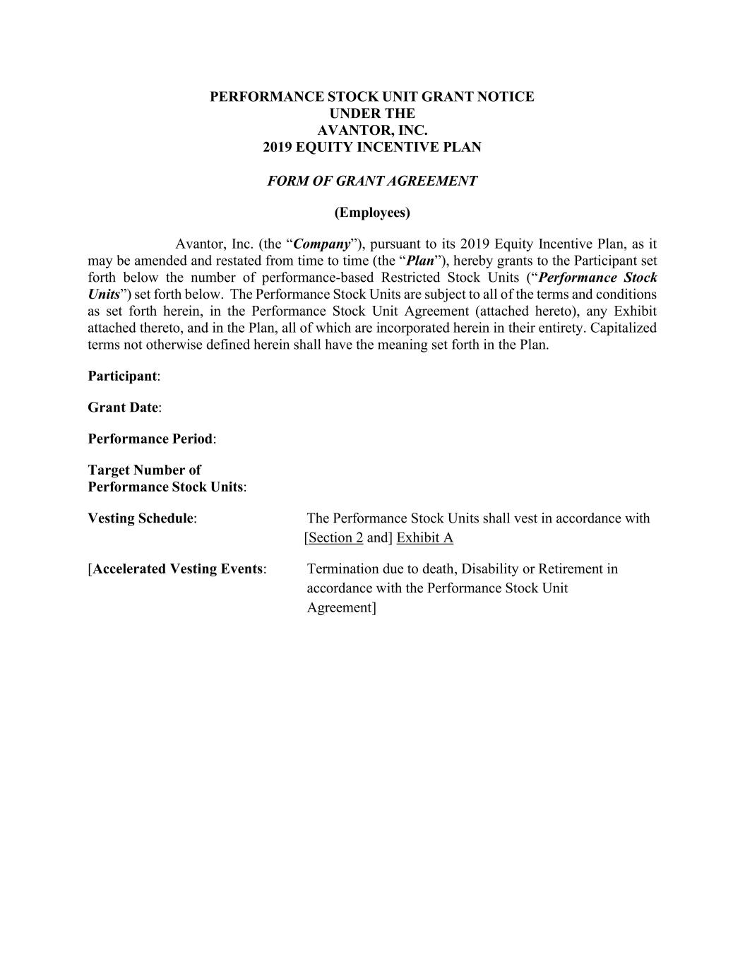 AVANTOR,INC2019年股权激励计划形式授予协议(员工)项下的业绩股票单位授予通知Avantor, Inc.(“公司”)根据其2019年股权激励计划(“计划”)(因其可能不时修订和重述),现向参与者授予下述基于业绩的限制性股票单位(“业绩股票单位”)的数量。绩效股票单位受本协议、绩效股票单位协议(随附)、随附的任何附件以及计划中规定的所有条款和条件的约束,所有这些条款和条件均已完整纳入本协议。本文未另行定义的大写术语应具有计划中规定的含义。参与者:授予日期:业绩期限:业绩股票单位目标数量:归属时间表:业绩股票单位应根据[第2节和] 附件 A [加速归属事件:根据业绩股票单位协议因死亡、残疾或退休而终止]