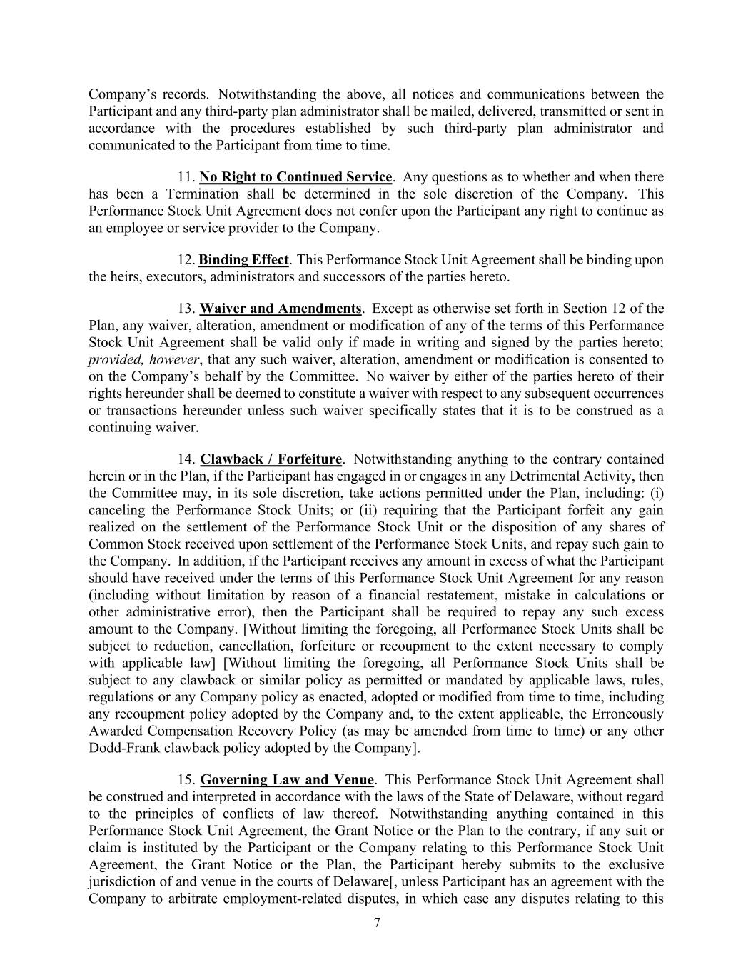 7公司的记录。尽管有上述规定,参与者与任何第三方计划管理人之间的所有通知和通信均应按照该第三方计划管理人制定的程序邮寄、交付、传送或发送,并不时传达给参与者。11.没有继续服务的权利。有关是否及何时有终止的任何问题,须由公司全权酌情决定。本绩效股票单位协议不授予参与者任何继续作为公司雇员或服务提供者的权利。12.绑定效果。本履约股票单位协议对协议各方的继承人、被执行人、管理人和继承人具有约束力。13.豁免及修订。除计划第12节另有规定外,对本业绩股票单位协议的任何条款的任何放弃、变更、修正或修改,只有在以书面作出并由协议各方签署的情况下才有效;但前提是委员会代表公司同意任何此类放弃、变更、修正或修改。本协议任何一方放弃其在本协议项下的权利,均不应被视为构成对本协议项下任何后续事件或交易的放弃,除非该放弃特别说明将被解释为持续放弃。14.追回/没收。尽管本文或计划中有任何相反的规定,如果参与者从事或从事任何有害活动,则委员会可全权酌情采取计划允许的行动,包括:(i)注销业绩股票单位;或(ii)要求参与者没收因业绩股票单位结算或处置在业绩股票单位结算时收到的任何普通股股份而实现的任何收益,并将该收益偿还给公司。此外,如果参与者因任何原因(包括但不限于财务重述、计算错误或其他行政错误)而收到的任何金额超过参与者根据本业绩股票单位协议条款应收到的金额,则参与者应被要求向公司偿还任何该等超额金额。【在不限制前述规定的情况下,所有业绩股票单位应在符合适用法律所需的范围内进行削减、注销、没收或补偿】【在不限制前述规定的情况下,所有业绩股票单位应遵守适用法律、规则、条例或不时颁布、采纳或修改的任何公司政策所允许或规定的任何回拨或类似政策,包括公司采取的任何补偿政策,并在适用的范围内,错误授予的赔偿追回政策(可能会不时修订)或公司采用的任何其他多德-弗兰克追回政策]。15.管辖法律和地点。本绩效股票单位协议应根据特拉华州的法律进行解释和解释,而不考虑其法律冲突原则。尽管本绩效股票单位协议、授予通知或计划中有任何与此相反的内容,但如果参与者或公司就本绩效股票单位协议、授予通知或计划提起任何诉讼或索赔,参与者特此提交特拉华州法院的专属管辖权和地点[,除非参与者与公司达成协议以仲裁与雇佣相关的争议,在这种情况下,与此相关的任何争议