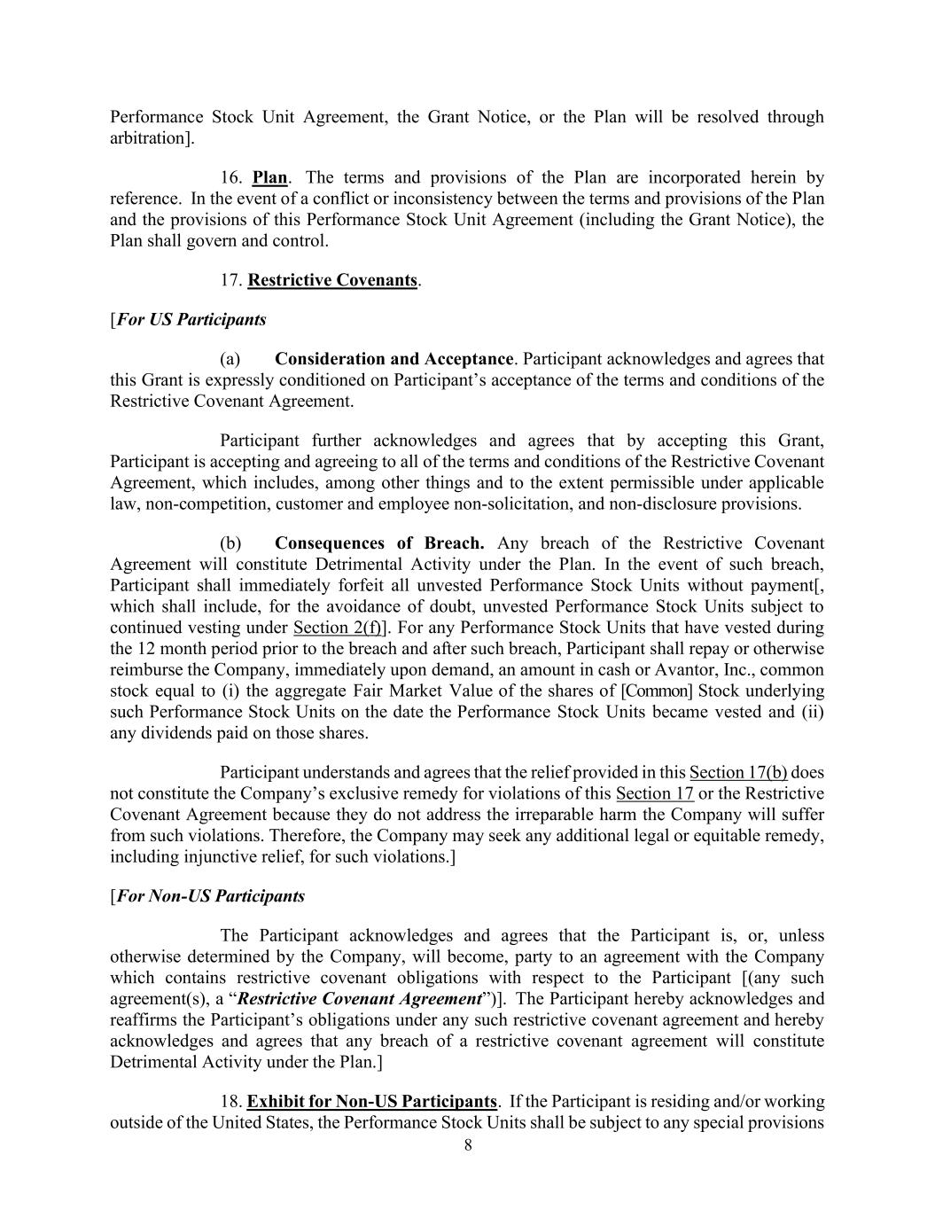 8业绩股票单位协议、授予通知书、或计划将通过仲裁解决】。16.计划。该计划的条款和规定通过引用并入本文。计划条款与本业绩股票单位协议(含授予通知书)的约定发生冲突或不一致时,由计划进行管辖和控制。17.限制性盟约。[对于美国参与者(a)考虑和接受。参与者承认并同意,此项授予明确以参与者接受限制性契约协议的条款和条件为条件。参与者进一步承认并同意,通过接受这项授予,参与者即接受并同意限制性契约协议的所有条款和条件,其中包括(其中包括)在适用法律允许的范围内、不竞争、客户和员工不招揽以及不披露条款。(b)违约后果。任何违反限制性契约协议的行为将构成该计划下的有害活动。如果发生此类违约,参与者应立即没收所有未归属的绩效股票单位,而无需付款[,为免生疑问,其中应包括根据第2(f)条继续归属的未归属绩效股票单位]。对于在违约发生前和违约发生后的12个月期间内已归属的任何业绩股票单位,参与者应在提出要求后立即以现金或Avantor, Inc.、普通股的形式向公司偿还或以其他方式偿还一笔金额,该金额等于(i)在业绩股票单位归属之日此类业绩股票单位所依据的[普通股]股票的总公平市值,以及(ii)就这些股份支付的任何股息。参与者理解并同意,本第17(b)条提供的救济不构成公司对违反本第17条或限制性公约协议的专属补救措施,因为它们没有解决公司将因此类违规行为而遭受的不可弥补的损害。因此,公司可能会就此类违规行为寻求任何额外的法律或衡平法补救措施,包括禁令救济。] [对于非美国参与者,参与者承认并同意,该参与者是,或者,除非公司另有决定,将成为与公司签订的包含与参与者有关的限制性契诺义务的协议的一方[(任何此类协议,“限制性契诺协议”)]。参与者在此承认并重申参与者在任何此类限制性契约协议下的义务,并在此承认并同意,任何违反限制性契约协议的行为将构成该计划下的有害活动。] 18。非美国参与者的附件。如参加者在美国境外居住和/或工作,表演股票单位须遵守任何特别规定