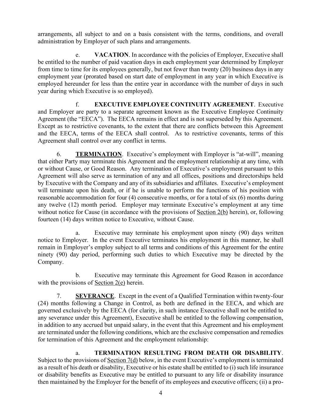 4. 所有安排均须遵循雇主制定的条款和条件,且这些安排必须符合雇主的整体管理方针。e. 休假。根据雇主的政策,高管有权享受每年一定数量的带薪休假天数,这些天数由雇主定期确定,通常每年不少于二十个商业日(具体天数根据高管入职日期进行计算,如果高管在某年的任职时间不足整年,则按该年内的实际任职天数来计算)。f. 高管连续聘用协议。高管与雇主还签订了一份名为“高管连续聘用协议”的单独协议。该协议仍然有效,不会因本协议的签署而失效。除非涉及限制性条款,否则在本协议与该协议之间存在冲突时,应以该协议的条款为准。6. 终止。高管与雇主之间的雇佣关系属于“随时终止”的关系,即任何一方都可以随时终止本协议及雇佣关系,无论是否有正当理由或充分理由。如果因本协议的原因导致高管被解雇,那么高管在公司及其子公司或附属公司的任何职位、职务或董事职位上的任期也将随之终止。如果高管死亡,或者因无法在合理的条件下继续履行其职责超过四个月,或者在十二个月内累计超过六个月无法履行职责,那么高管与雇主的雇佣关系将终止。雇主可以在任何时间因正当理由而终止高管的雇佣关系(依据本协议的第2(b)条),也可以在向高管发出十四天书面通知后,无需理由即可终止雇佣关系。a. 高管可以在向雇主发出九十天的书面通知后终止雇佣关系。在这种情况下,高管仍需在九十天内遵守本协议的各项条款,并继续履行公司安排给他的职责。b. 如果高管有正当理由,可以根据本协议的第2(e)条终止本协议。7. 离职补偿。除非是在控制权变更后的二十四个月内发生符合《高管连续聘用协议》定义的合格终止情况,这种情况下协议才具有专属效力(为了明确起见,在这种情况下,高管无权获得本协议的任何离职补偿),否则在高管因死亡或残疾而终止雇佣关系的情况下,高管或其遗产有权获得以下补偿,此外还有已累积但未支付的工资:a. 因死亡或残疾而终止雇佣关系的情况。根据下文第7(d)条的规定,如果高管因死亡或残疾而终止雇佣关系,那么高管或其遗产有权获得雇主为其员工和高级管理人员提供的任何人寿保险或残疾福利;
