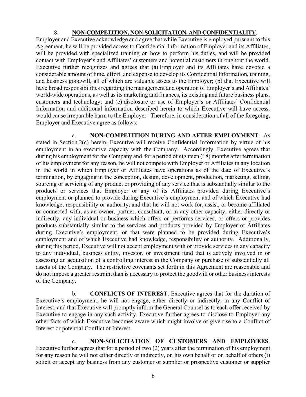 68. 不竞争、不招揽客户以及保密义务。雇主与员工均承认并同意:在员工依照本协议受雇期间,员工有权获取雇主及其附属公司的机密信息,并将接受有关如何履行其职责的专门培训。此外,员工还将有机会与雇主及附属公司的客户和潜在客户进行联系。员工还认识到并同意:(a) 雇主及其附属公司花费了大量时间、精力和资金来开发其机密信息、培训体系以及商业信誉,这些都属于雇主的宝贵资产;(b) 员工将负责管理和运营雇主及其附属公司的全球业务,包括市场营销、财务管理、现有及未来的业务计划、客户和技术资源;(c) 若员工泄露或使用雇主或附属公司的机密信息以及其他本条款中规定的信息,将会对雇主造成不可挽回的损害。因此,基于上述所有因素,雇主与员工达成如下协议:a. 在受雇期间及之后,员工不得与雇主或附属公司在任何地点进行竞争。正如本协议的第2(c)条所述,员工因担任公司高管而获得机密信息。因此,员工同意在受雇期间以及离职后十八个月内,不得在与雇主或附属公司业务相关的任何地方从事与它们类似的活动,包括产品的设计、开发、生产、营销、销售、采购或服务提供等。同时,员工不得直接或间接为那些提供或销售与雇主或附属公司提供的产品或服务类似的服务或产品的个人或企业工作、协助或建立任何关联关系。此外,在此期间,员工不得接受任何个人、企业、投资者或投资基金的雇佣或服务提供,这些机构正在积极寻求或评估收购公司的控股权或购买公司的全部资产。本协议中规定的限制条款是合理的,不会给公司的商誉或其他商业利益带来不必要的限制。b. 利益冲突。员工同意在受雇期间不得直接或间接参与任何利益冲突行为,并且一旦发现可能引发利益冲突的情况,应立即通知法律顾问。此外,员工还同意向雇主披露所有可能引起利益冲突的事实。c. 不招揽客户和员工。员工还同意,在离职后两年内,不得直接或间接为自己或他人招揽或接受任何客户或供应商的业务。