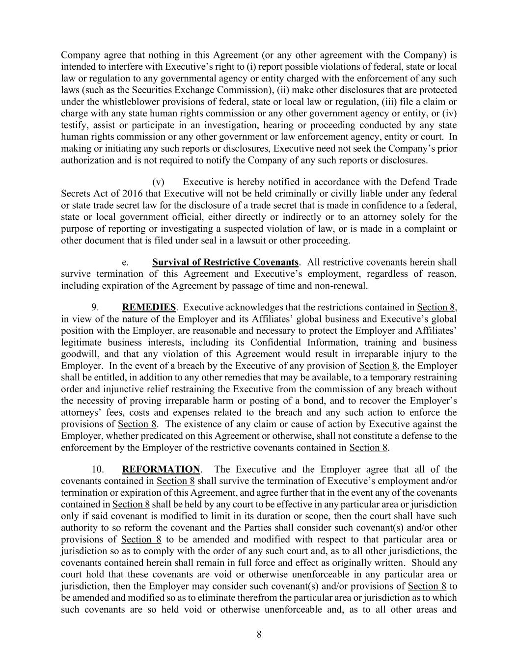 8. 双方同意,本协议(或任何与公司签订的其它协议)中的内容不得妨碍执行人员以下权利:(i)向负责执行相关法律的政府机构或实体报告可能违反联邦、州或地方法律或法规的行为;(ii)根据联邦、州或地方法律或法规中关于举报人的规定进行其他信息披露;(iii)向任何州人权委员会或其他政府机构或实体提出索赔或指控;(iv)作为证人出庭、协助或参与由任何州人权委员会或其他政府、执法机构、实体或法院进行的调查、听证或程序。在执行或启动上述报告或信息披露时,执行人员无需事先获得公司的授权,也无需通知公司有关这些报告或信息披露的情况。(v)根据2016年《商业秘密保护法》,执行人员被通知:对于向联邦、州或地方政府官员披露商业秘密的行为,无论是否直接或间接为之,或者向律师披露以用于报告或调查涉嫌违法行为的行为,或者在诉讼或其他程序中以密封方式提交的文件中披露商业秘密的行为,执行人员不会因这些行为而承担任何联邦或州的商业秘密法律下的刑事责任或民事责任。9. 补救措施。执行人员承认,鉴于雇主及其附属机构的全球业务性质以及执行人员在雇主中的全球地位,第8条中所规定的限制措施是合理且必要的,这些措施旨在保护雇主及其附属机构的合法商业利益,包括其机密信息、培训成果和商业商誉。如果执行人员违反第8条的任何条款,雇主有权采取临时限制措施,以防止执行人员继续违反条款,而无需证明会造成不可修复的损害或提供担保。此外,雇主还有权收回因执行第8条条款而产生的律师费、成本和费用。执行人员对雇主提出的任何索赔或诉讼,无论是基于本协议还是其他原因,都不应成为雇主执行第8条中限制性约定的理由。10. 修改。执行人员和雇主同意,第8条中的所有条款在执行人员的雇佣关系终止或本协议终止/失效后仍然有效。此外,如果第8条中的任何条款被法院认定仅在特定地区或司法管辖区有效,那么法院有权对该条款进行修改,以使该条款符合法院的裁决。对于所有其他司法管辖区而言,本协议中的条款仍然具有完全效力。如果法院认为这些条款在特定地区或司法管辖区无效或不可执行,那么雇主可以考虑对这些条款进行修改,以消除该条款在那些被认为无效或不可执行的地区或司法管辖区中的适用。