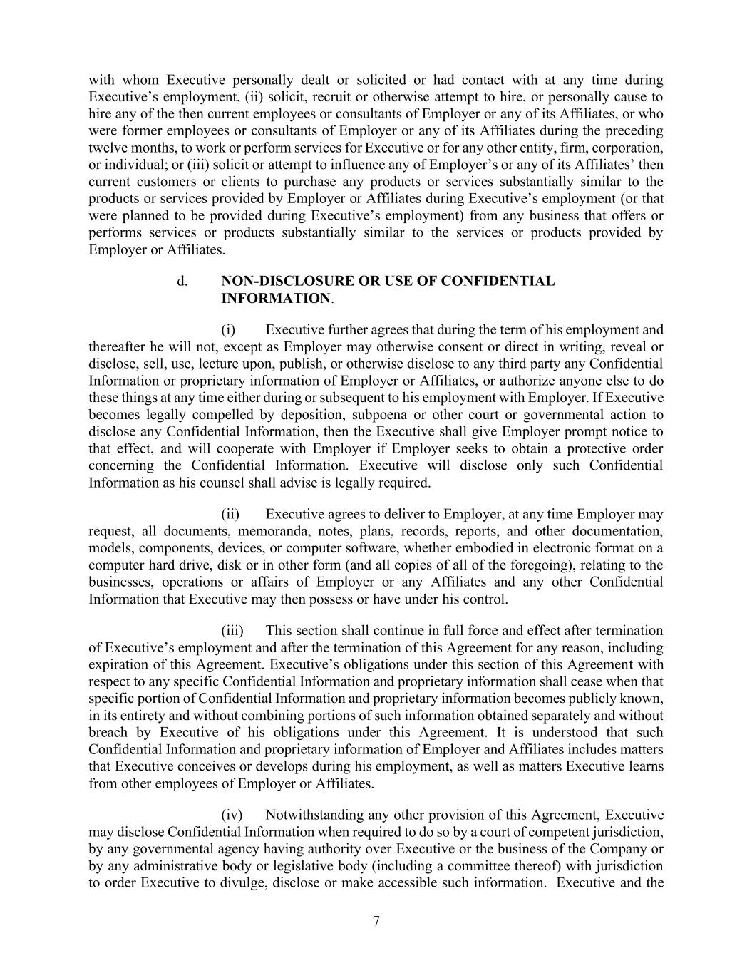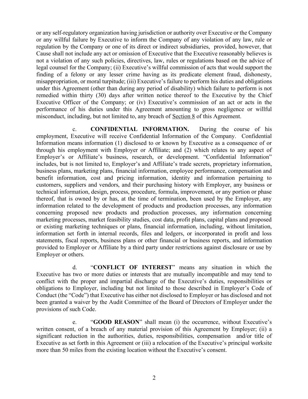 2. 或任何具有管辖权或权力的自律组织,针对执行方或公司所违反的任何法律、规则或法规的行为;不过,前提是执行方在得知公司或其直接或间接子公司违反任何法律、规则或法规后,未能及时通知公司。当然,执行方的任何行为或不行为,只要其认为这些行为并不违反任何政策、指令、法律、规则或法规,且是在公司法律顾问的建议下做出的,则不被视为违规行为;(ii) 执行方故意实施的行为,这些行为可能导致被认定为重罪或轻罪,而这些行为的核心要素是欺诈、不诚实、挪用资金或道德沦丧等违法行为;(iii) 执行方未能履行本协议规定的职责和义务(除非是因残疾而无法履行),而该未能履行的情况在公司向执行方发出书面通知后三十天内仍未得到纠正;(iv) 执行方在履行本协议职责过程中所犯下的行为,这些行为属于重大过失或故意渎职行为,包括但不限于违反本协议第8条的行为。c. 机密信息。在任职期间,执行方将获得公司的机密信息。机密信息指的是因执行方与雇主或附属公司的雇佣关系而获得的、或与雇主或附属公司的业务、研究或开发相关的信息。“机密信息”包括但不限於雇主和附属公司的商业秘密、专有信息、商业计划、营销计划、财务信息、员工绩效、薪酬福利信息、成本定价信息、客户、供应商及其与雇主的采购历史记录、任何业务或技术信息、设计、流程、程序、配方、改进措施,以及那些在终止合同时已被雇主拥有或使用的信息,还包括与产品开发和生产过程相关的信息、关于新产品的信息、与市场营销过程相关的信息、市场可行性研究、成本数据、利润计划、资本计划以及拟议或现有的市场营销技术和计划、财务信息,包括内部记录、文件、账本中的信息,以及由第三方提供给雇主或附属公司的、受保密条款限制的信息。d. “利益冲突”是指执行方同时面临两种或更多相互冲突的职责或利益的情况,这些情况可能会影响到执行方对雇主的职责的履行,包括但不限于《雇主行为准则》中所述的情况,而执行方并未将这些情况告知雇主,或者虽然告知了雇主,但并未获得董事会审计委员会的支持来免除这些责任。e. “正当理由”指以下情况:(i) 雇主未经执行方书面同意,违反本协议的任何重要条款;(ii) 执行方的权力、职责、薪酬或地位大幅减少,符合本协议的规定;(iii) 执行方的主要工作场所距离现有地点超过50英里,且未经执行方同意进行搬迁。