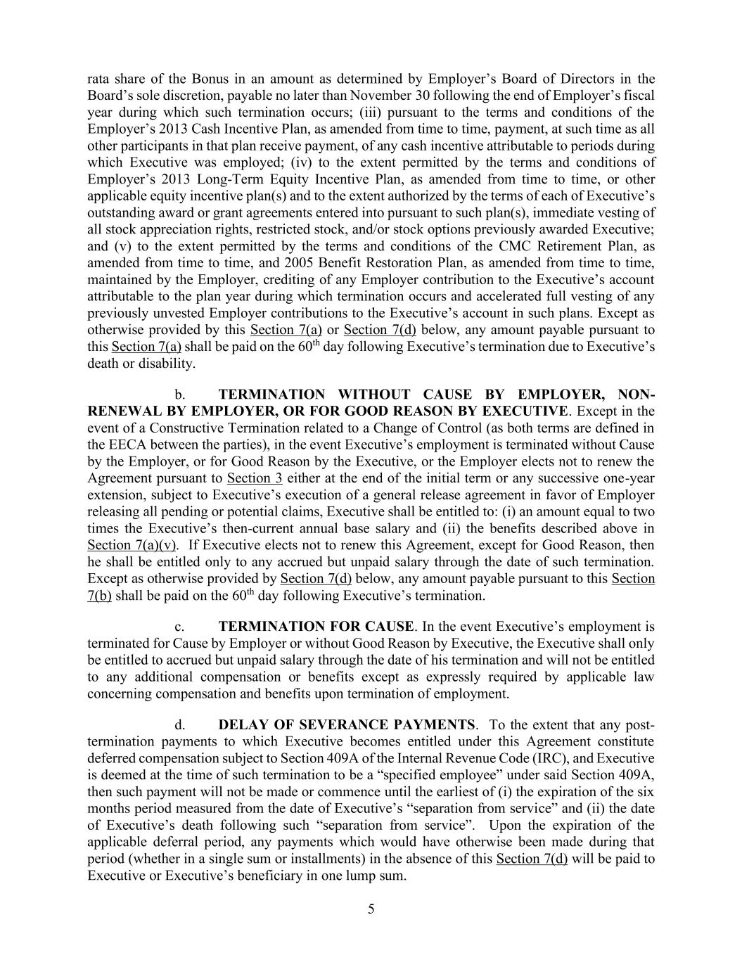 5. 奖金的5等份分配款,金额由雇主董事会根据自行决定予以确定,该款项应在雇主财年结束后的11月30日之前支付;(iii) 根据雇主2013年现金激励计划的条款和条件,该计划可随时进行修订,在该计划的其他参与者收到报酬之后,应向执行人员支付其在任职期间应得的现金激励报酬;(iv) 在符合雇主2013年长期股权激励计划条款和条件的范围内,以及任何其他适用的股权激励计划的规定范围内,并且在执行人员的现有奖励或授予协议规定的范围内,应立即享有所有先前授予执行人员的股票增值权、限制性股票和/或股票期权;以及(v) 在符合雇主制定的CMC退休计划条款和条件的范围内,以及2005年福利恢复计划的条款和条件的范围内,应将因离职年度而属于雇主的贡献记入执行人员的账户,并加速享有这些计划中尚未兑现的雇主贡献。除非本节7(a)或7(d)另有规定,本节7(a)所规定之应付金额应在执行人员因死亡或残疾而离职后的第60天支付。b. 雇主无理由终止雇佣关系、不续签合同,或执行人员因正当理由终止雇佣关系的情况。除非是因控制权的变更而终止雇佣关系(双方之间的雇佣关系中有关于此的明确约定),否则如果执行人员的雇佣关系因雇主无理由终止,或执行人员因正当理由终止雇佣关系,或者雇主根据第3条在初始期限结束时或任何后续的一年延长期限内选择不再续签合同,那么执行人员有权获得:(i) 相当于执行人员当时年薪两倍的金额;(ii) 本节7(a)(v)中描述的福利。如果执行人员选择不续签合同,除非因正当理由,那么他只有权获得截至离职日期为止的未付工资。除非本节7(d)另有规定,本节7(b)所规定之应付金额应在执行人员离职后的第60天支付。c. 因特定原因终止雇佣关系的情况。如果执行人员的雇佣关系因雇主的特定原因终止,或者执行人员无正当理由终止雇佣关系,那么执行人员仅有权获得截至离职日期为止的未付工资,而不再享有任何额外的补偿或福利,除非适用法律对雇佣关系终止时的补偿和福利有明确规定。d. 离职付款的延迟支付。如果根据本协议,执行人员有权获得的离职后付款属于《国内税收法》第409A条的递延补偿,并且在离职时执行人员被视为该条款下的“指定员工”,那么此类付款将在以下时间中最早发生:(i) 从执行人员“离职”之日起六个月的期限到期时;(ii) 执行人员“离职”后的死亡日期。在适用的递延期届满后,如果在此期间原本应该支付的款项(无论是一次性还是分期支付)在没有本节7(d)的情况下是可以支付的,那么这些款项将一次性支付给执行人员或其受益人。