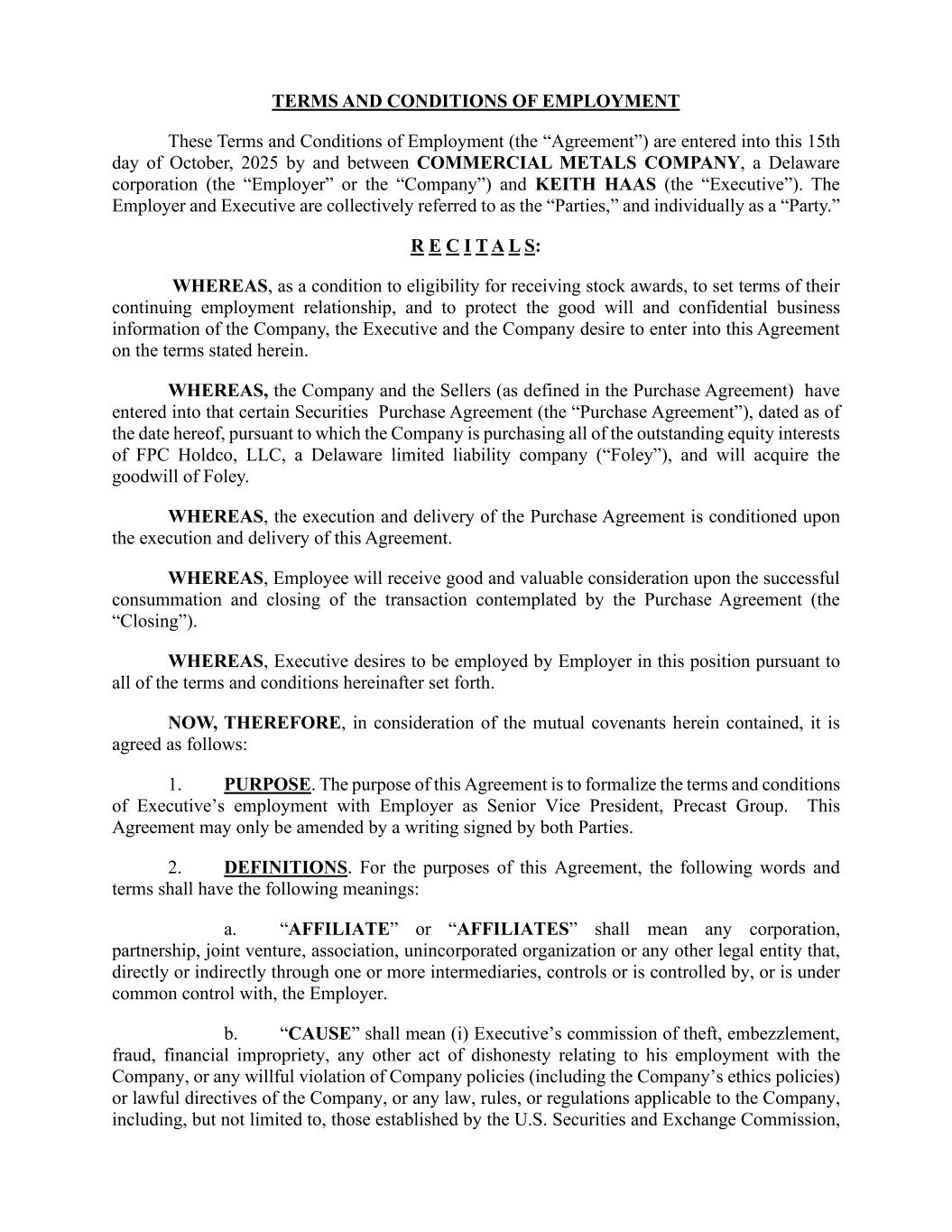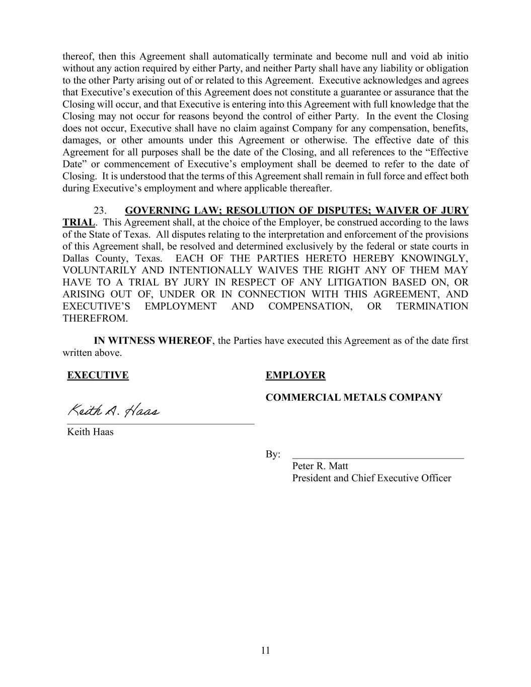 本协议的第十一条规定,本协议自本日起即自动终止并失效,双方无需采取任何行动即可解除本协议。任何一方均无需对因本协议而产生的任何责任或义务负责。执行方承认并同意,执行方签署本协议并不构成对交易能够完成的保证,执行方在签署本协议时完全了解交易可能无法完成,而这一结果属于双方无法控制的因素。如果交易未能完成,执行方无权要求公司支付任何补偿、福利、赔偿或其他款项。本协议的生效日期为交易完成之日,所有关于“生效日期”或执行方开始任职的提及都应视为指该交易完成之日。双方同意,在本方任职期间以及此后适用的情况下,本协议的条款将继续有效。第二十三条 适用法律;争议解决;放弃陪审团审判的权利。根据雇主的选择,本协议应依据德克萨斯州的法律进行解释。与本协议的解释和执行相关的所有争议,应由德克萨斯州达拉斯县的联邦法院或州法院独家审理和裁决。双方均自愿且明确放弃就基于本协议或与之相关的任何诉讼,或涉及执行方的雇佣关系及报酬问题,向陪审团提起诉讼的权利。为此,双方于上述日期签署了本协议。执行方雇主:商业金属公司 Keith Haas 签署人:Peter R. Matt 总裁兼首席执行官