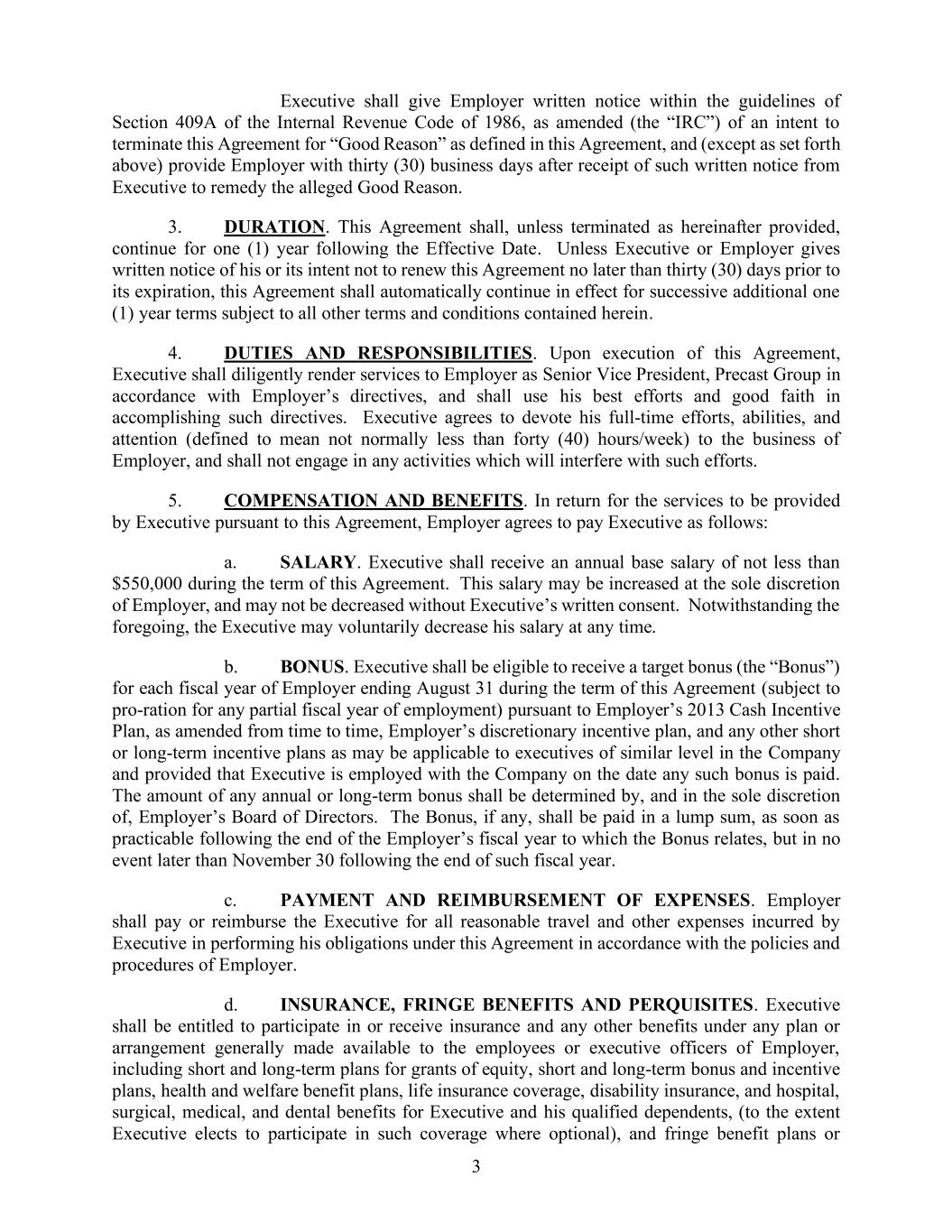 3. 执行方应依照1986年《国内税收法》第409A条的規定,以書面形式通知雇主,表明因“正当理由”而终止本協議的意願。在收到執行方的書面通知後三十個工作日內,執行方應採取措施消除所謂的“正当理由”。3. 期限。本協議自生效日起計一年,除非按照以下條款終止。如果執行方或雇主在協議到期前三十天內書面通知不繼續履行本協議,則本協議將自動延長一年,並遵循本協議中的所有其他條件和規定。4. 義務與責任。執行方在簽訂本協議後,應按照雇傭方的指示,以高級副總裁的身份為雇傭方提供服務,並盡其最大努力履行上述職責。執行方同意全時投入工作,並不得從事任何可能影響其工作進度的活動。5. 報酬與福利。作為對執行方按照本協議提供的服務的補償,雇傭方同意按以下方式支付報酬:a. 工資。在協議期間,執行方應獲得每年不少于550,000美元的基薪。這筆工資可以由雇傭方自行決定調整,且必須得到執行方的書面同意才能減少。不過,執行方可以隨時自願減少工資。b. 獎金。在協議期間,如果雇傭方的財政年度截止於8月31日,執行方有權根據雇傭方的2013年現金激勵計劃以及其他相關激勵計劃獲得獎金。具體數額由雇傭方的董事會決定。如果有的話,獎金將在該財政年度終結後尽快支付,但最遲不得晚於該財政年度終結後的11月30日。c. 費用支付與報銷。雇傭方應按照自己的政策和程序,支付或報銷執行方在履行本協議中所产生的所有合理旅行費用及其他費用。d. 保險、附屬福利及優惠。執行方有權參加或享受雇傭方為員工提供的任何保險及福利計劃,包括短期和長期的股權授予計劃、短期和長期的獎金及激勵計劃、健康與福利計劃、人身保險、失能保險,以及醫院、手術、醫療和牙科等方面的福利。