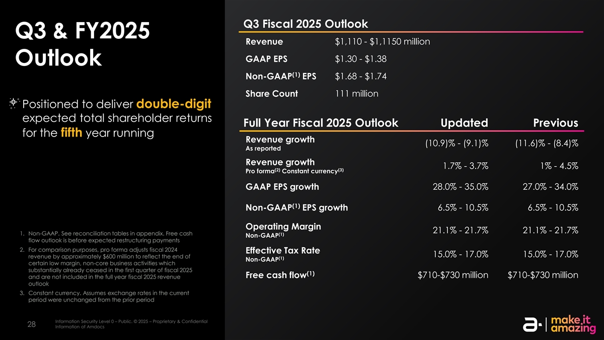 2025财年Q3展望Q3 & 2025财年收入$ 1,110-$ 11.50亿$ 1.30-$ 1.38 GAAP EPS Outlook(1)Non-GAAP EPS $ 1.68-$ 1.74股票计数1.11亿定位于实现两位数的预期股东总回报2025财年全年展望连续第五年更新收入增长(10.9)%-(9.1)%(11.6)%-(8.4)%报告收入增长1.7%-3.7% 1%-4.5%(2)(3)备考不变货币28.0%-35.0% 27.0%-34.0% GAAP EPS增长(1)Non-GAAP EPS增长6.5%-10.5% 6.5%-10.5%营业利润率21.1%-21.7% 21.1%-21.7% 1。非公认会计原则。见附录中的调节表。自由现金(1)Non-GAAP流动前景在预期重组付款之前2。为便于比较,备考将2024财年有效税率15.0%-17.0% 15.0%-17.0%收入调整约6亿美元,以反映(1)非美国通用会计准则某些低利润率、非核心业务活动的结束,这些活动在2025财年第一季度基本上已经停止(1)自由现金流7.10-7.3亿美元7.10-7.3亿美元,不包括在2025财年全年收入展望3中。不变的货币。假设本期汇率与上一期信息安全等级0保持不变–公开。©2025 –专有和机密信息安全等级2 –敏感。©2025 – AmDocs的专有和机密信息2828 AmDocs的信息