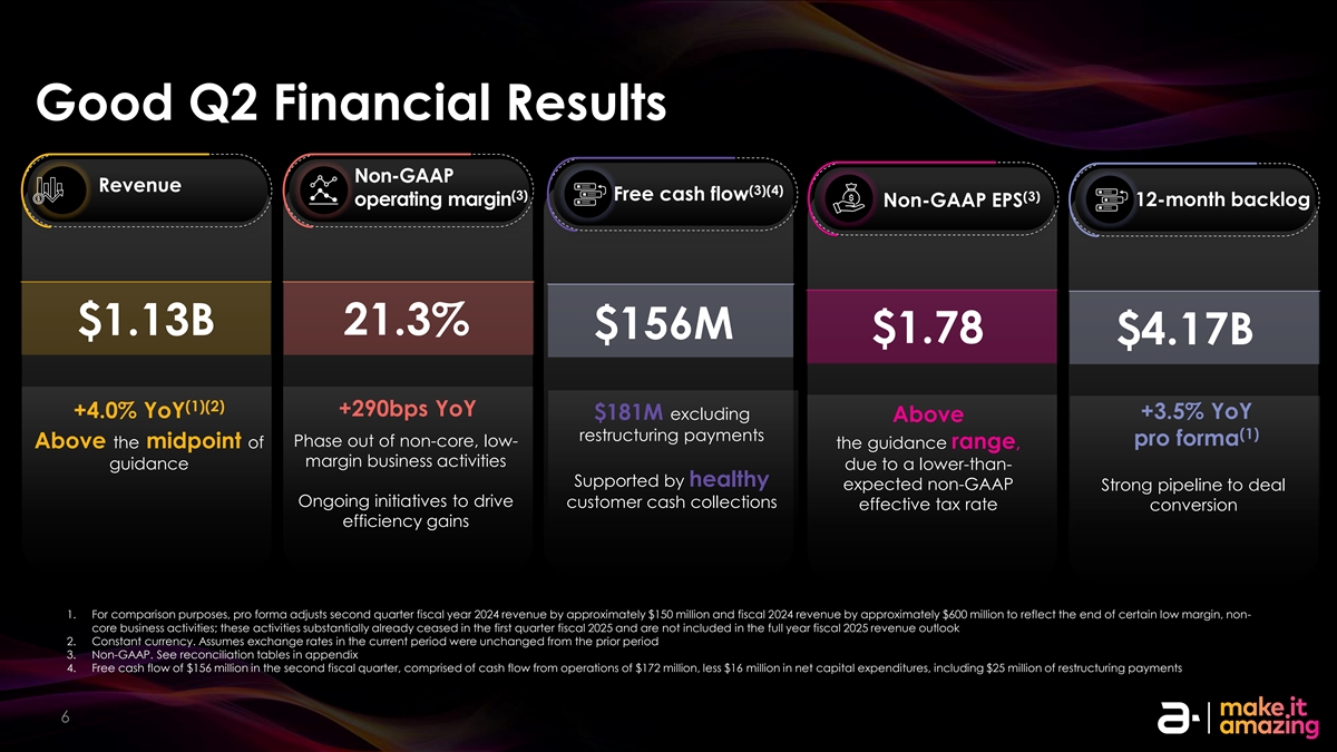 良好的第二季度财务业绩非GAAP收入(3)(4)(3)自由现金流(3)营业利润率12个月积压非GAAP EPS $ 1.13B 21.3% $ 1.56亿$ 1.78 $ 4.17B(1)(2)+ 290bps YoY + 4.0% YoY + 3.5% YoY $ 1.81亿不包括以上(1)重组付款备考逐步取消非核心,低于指导范围的中点,利润率业务活动指导由于低于支持健康的预期非GAAP强大管道处理持续举措以推动客户现金收款有效税率转换效率收益1。为便于比较,备考将2024财年第二季度收入调整约1.5亿美元,将2024财年收入调整约6亿美元,以反映某些低利润率、非核心业务活动的结束;这些活动在2025财年第一季度基本上已经停止,不包括在2025财年全年收入展望2中。不变的货币。假设本期汇率与上一期持平3。非公认会计原则。见附录4中的调节表。第二财季的自由现金流为1.56亿美元,其中包括1.72亿美元的运营现金流,减去1600万美元的净资本支出,其中包括2500万美元的重组付款信息安全Level 0 – Public。©2025 – AMDOCs的专有和机密信息66