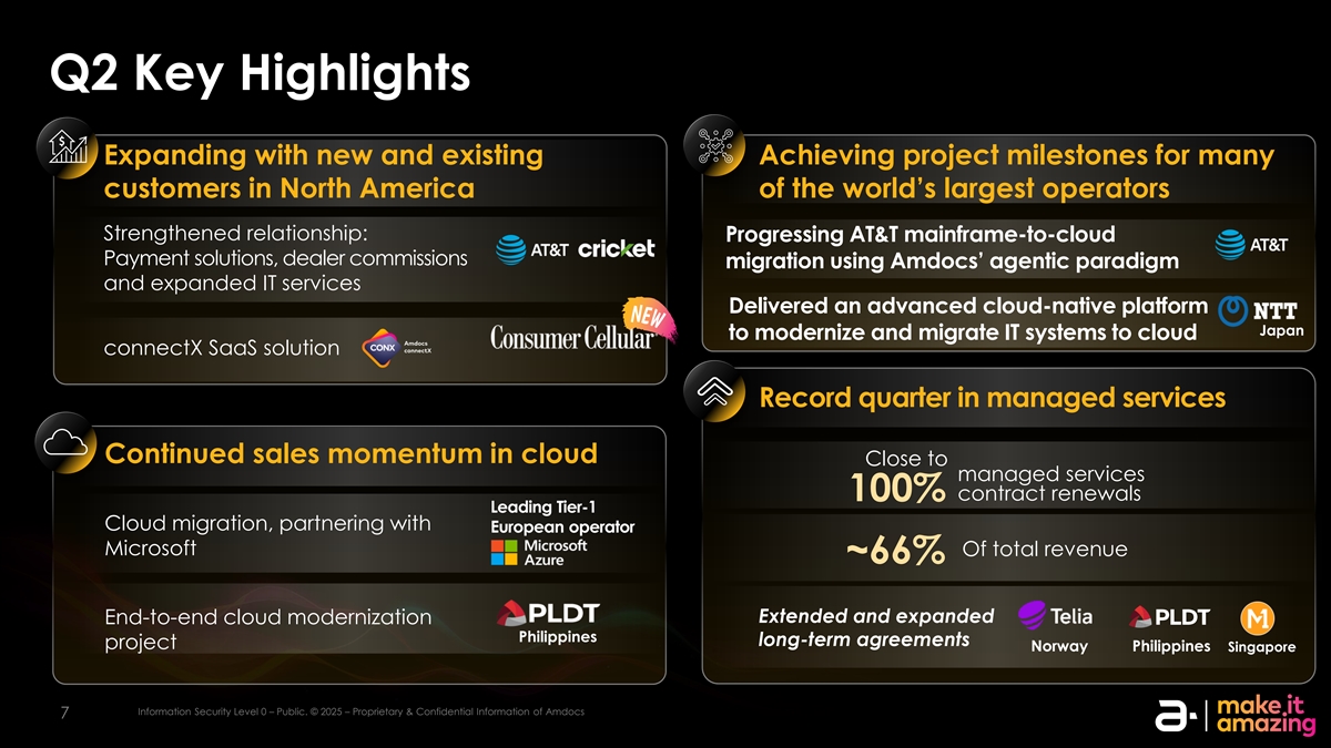 Q2主要亮点以新的和现有的方式进行扩展为全球最大运营商北美的许多客户实现项目里程碑加强了关系:推进美国电话电报主机到云的支付解决方案,经销商使用AMDOCs的代理范式委托迁移并扩展IT服务提供先进的云原生平台日本,以实现IT系统的现代化并将其迁移到云connectX SaaS解决方案托管服务记录季度持续的云销售势头接近托管服务100%续约引领Tier-1云迁移,与欧洲运营商微软合作总收入~66%延长和扩大端到端云现代化菲律宾长期协议项目挪威菲律宾新加坡IIN NF for orm ma at tiion on SE Sec cu ur riit ty y L Le evel vel 00 –– p pu ub blliic c.。©©20202525 – – P PR rop opr riie et ta ar ry y & & con conf fiid de en nt tiia all iin nf for orm ma at tiion on of a am md doc ocs 77