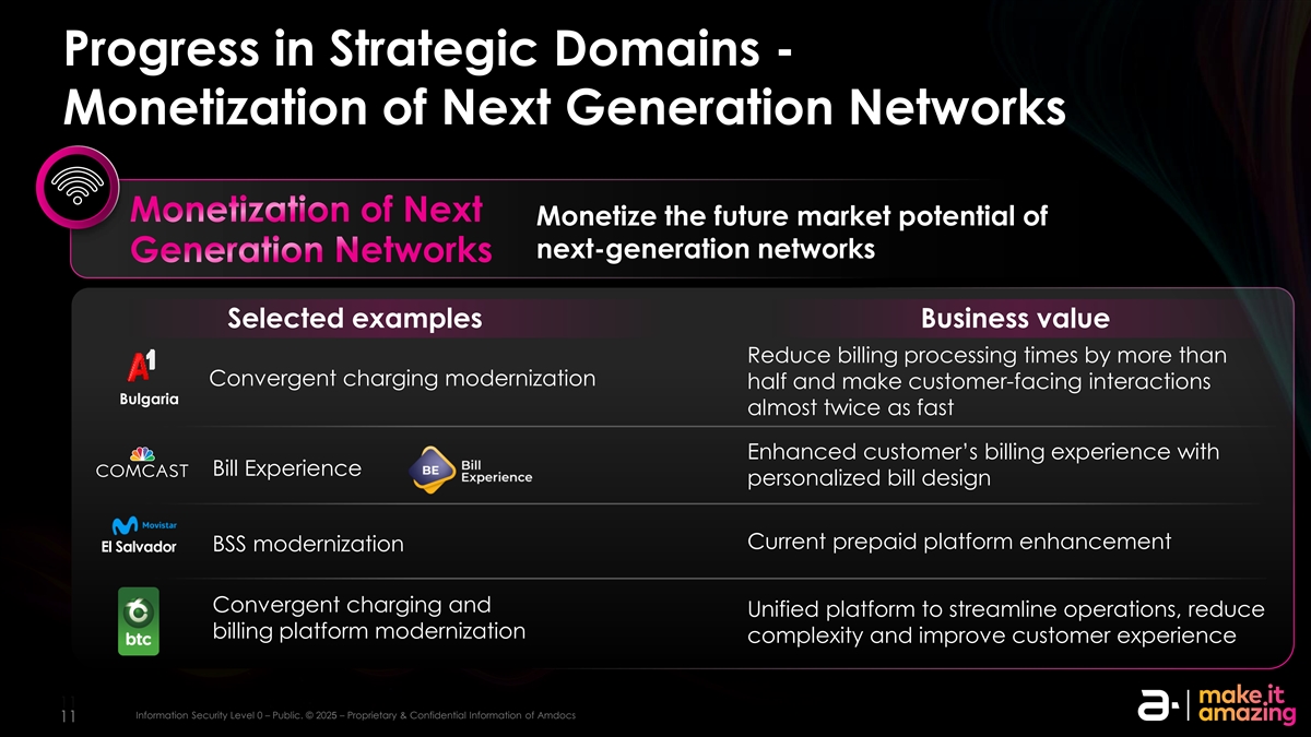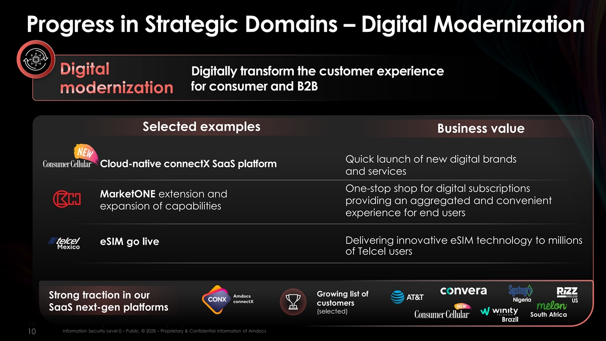 战略领域的进展–数字化现代化数字化为消费者和B2B现代化数字化改造客户体验精选实例商业价值快速推出新的数字品牌Cloud-native connectX SaaS平台和服务一站式数字订阅MarketONE扩展并提供聚合为终端用户提供便利的能力体验扩展向数百万eSIM提供创新eSIM技术上线Telcel用户的墨西哥日益增长的尼日利亚强劲牵引力名单美国客户SaaS下一代平台(选定)南非巴西iIN nf for orm ma at tiion on SE sec cu ur riit ty y L le evel vel 00 –– p pu ub blliic c.。©©20202525 – – P PR rop opr riie et ta ar ry y & & con conf fiid de en nt tiia all iin nf for orm ma at tiion on of a am md doc ocs 10 Information Security Level 0 – public。©2025 – AMDOCs 10的专有和机密信息