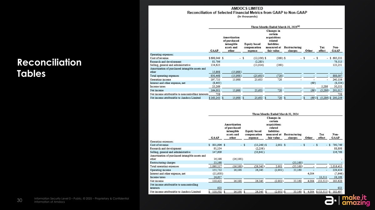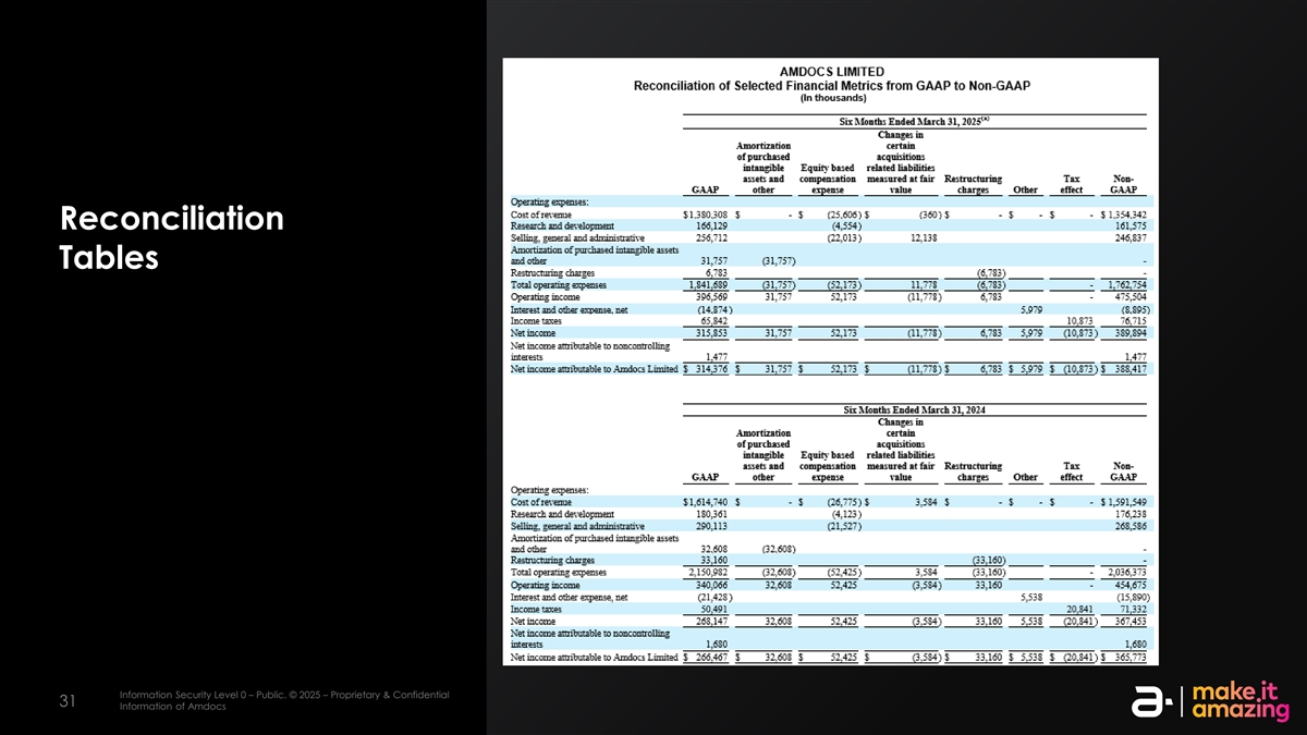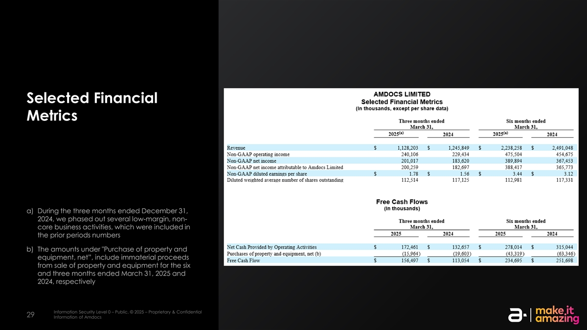 选定财务指标a)在截至2024年12月31日的三个月内,我们分阶段取消了几项低利润率、非核心业务活动,这些活动包含在前期数字b)购买物业和设备项下的金额,净额”,包括截至2025年3月31日和2024年3月31日的六个月和三个月出售物业和设备的非实质性收益,分别为信息安全级别0–公共。©2025 –专有和机密信息安全等级2 –敏感。©2025 – AmDocs的专有和机密信息2929 AmDocs的信息