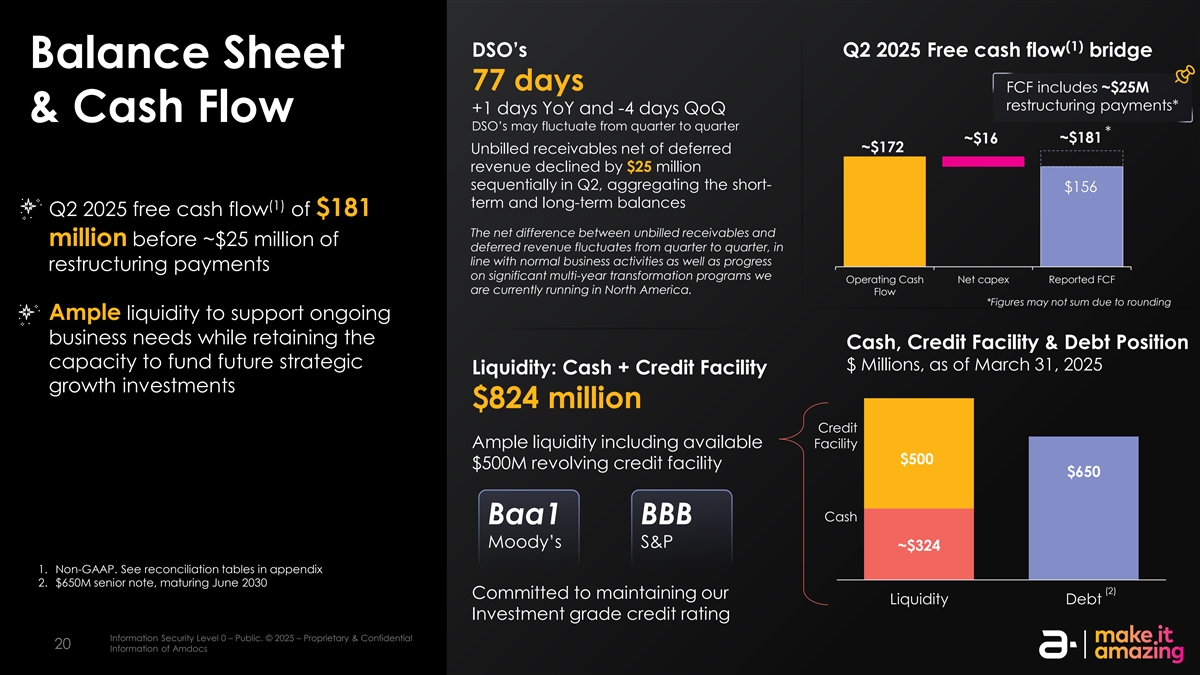 (1)DSO 2025年Q2自由现金流桥梁资产负债表中77天的FCF包括~2500万美元的重组付款*+ 1天YoY和-4天QoQ & Cash Flow DSO的季度间或有波动*~$ 181~$ 16~$ 172扣除递延收入的未开票应收款Q2环比下降2500万美元,将短期156美元的定期和长期余额合计(1)2025年Q2自由现金流181美元未开票应收款与扣除~2500万美元递延收入前的百万之间的净差额在每个季度之间波动,根据正常的业务活动以及重大多年期转型计划的进展重组付款,我们运营现金净资本支出报告的FCF目前正在北美运行。流量*数字可能未加总,原因是截至2025年3月31日,为支持持续的业务需求而保持现金、信贷便利和债务头寸能力,同时保留为未来战略数百万美元提供资金的充足流动性流动性流动性:现金+信贷便利增长投资8.24亿美元信贷充足流动性,包括可用便利5亿美元循环信贷便利650美元现金Baa1 BBB穆迪标普~3241美元。非公认会计原则。见附录2中的调节表。6.5亿美元优先票据,2030年6月到期(2)致力于维持我们的流动性债务投资级信用评级信息安全等级0–公开。©2025 –专有和机密信息安全等级2 –敏感。©2025 – AMDOCs的专有和机密信息2020 AMDOCs的信息