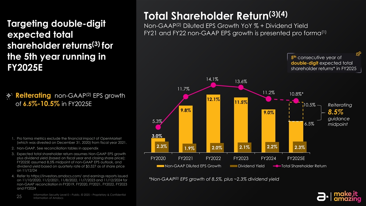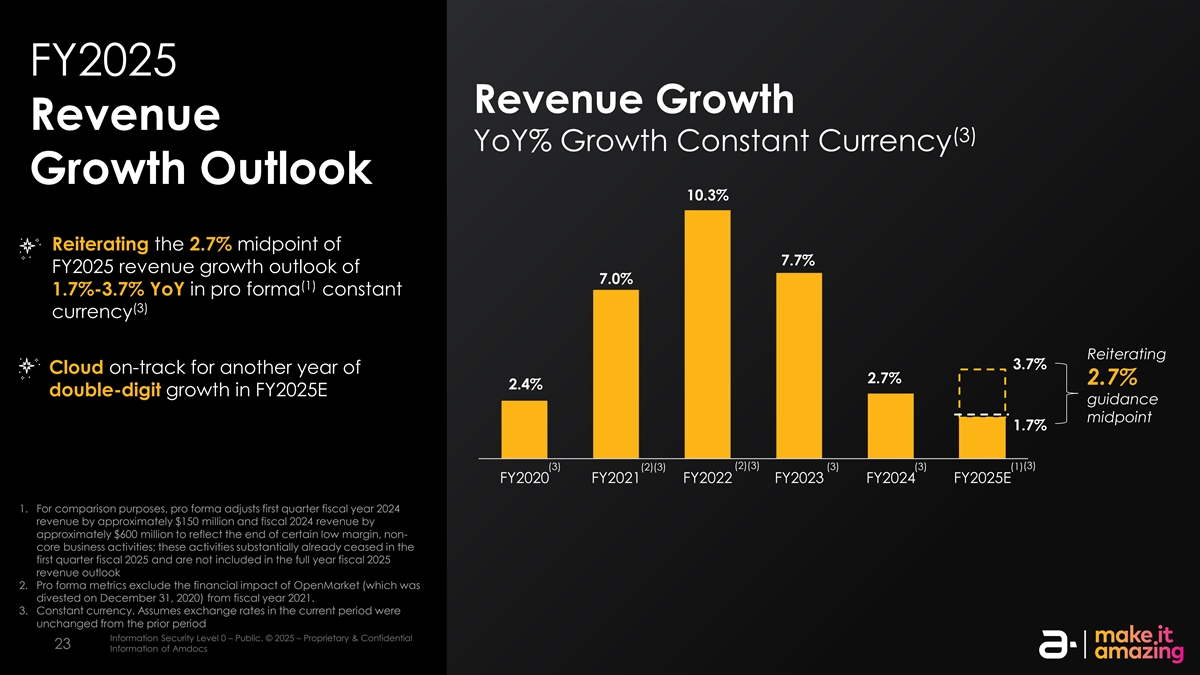 FY2025收入增长收入(3)同比%增长恒定货币增长前景10.3%重申2.7%中点7.7% FY2025收入增长前景7.0%(1)1.7%-3.7 %备考不变同比(3)货币重申3.7% Cloud on track另一年2.7% 2.7% 2.4%两位数增长FY2025E指引中点1.7%(2)(3)(3)(3)(3)(1)(2)(3)FY2020 FY2021 FY2022 FY2023 FY2024 FY2025E 1。为便于比较,备考将2024财年第一季度收入调整约1.5亿美元,将2024财年收入调整约6亿美元,以反映某些低利润率、非核心业务活动的结束;这些活动在2025财年第一季度基本上已经停止,不包括在2025财年全年收入展望2中。备考指标不包括OpenMarket(于2020年12月31日剥离)对2021财年的财务影响。3.不变的货币。假设本期汇率与上一期信息安全等级0保持不变–公开。©2025 –专有和机密信息安全等级2 –敏感。©2025 – AmDocs的专有和机密信息2323 AmDocs的信息
