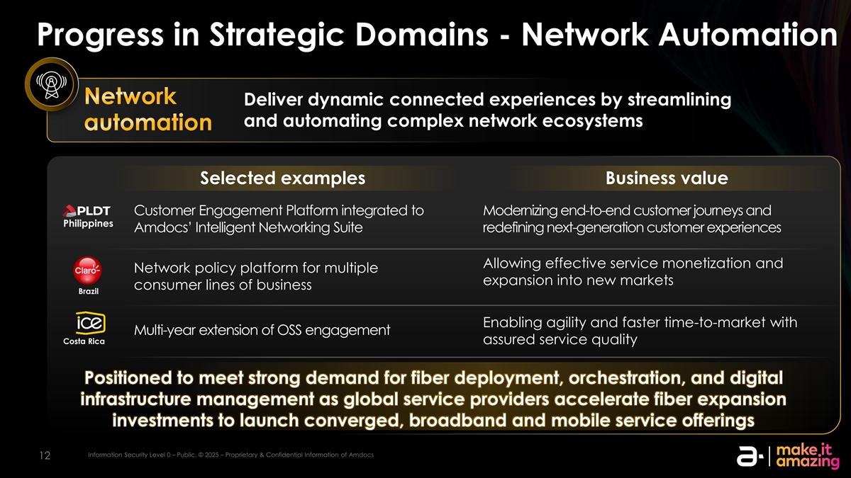 战略领域的进展-下一代网络的货币化Next的货币化将下一代网络的未来市场潜力货币化精选实例商业价值将账单处理时间减少一半以上Convergent收费现代化并使面向客户的交互几乎快于保加利亚的两倍增强客户的账单体验与账单体验个性化账单设计当前的预付费平台增强BSS现代化萨尔瓦多Convergent收费和统一平台以简化运营,降低计费平台现代化的复杂性并提高客户体验信息安全等级0–公。©2025 – AMDOCs 11信息安全0级的专有和机密信息–公开。©2025 – AMDOCs 11的专有和机密信息