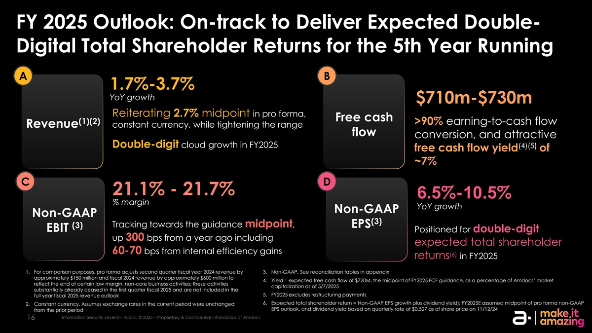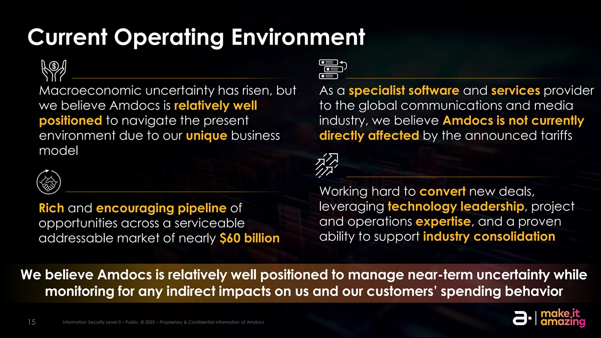 当前的运营环境宏观经济不确定性有所上升,但作为一家专业的软件和服务提供商,我们认为AMDOCs相对更适合定位于驾驭当前行业的全球通信和媒体,我们认为AMDOCs目前不是环境,因为我们独特的业务直接受到已宣布的关税模式的影响,我们努力转换新的交易,利用技术领先优势,项目丰富且令人鼓舞的管道和运营专业知识,以及在支持行业整合的可服务能力方面得到证明的机会近600亿美元的潜在市场我们认为,AmDocs相对处于有利地位,可以管理近期的不确定性,同时监测对我们和客户的消费行为的任何间接影响信息安全等级0–公共。©2025 – AMDOCs信息安全0级的专有&机密信息–公开。©2025 – AmDocs的专有和机密信息1515