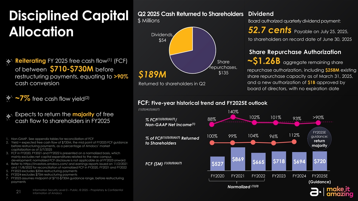 2025年第二季度现金返还股东股息纪律资本百万美元董事会授权季度股息支付:52.7美分将于2025年7月25日支付,分配股息,于记录日期为2025年6月30日向股东支付54美元的股票回购授权(1)重申2025财年自由现金流(FCF)股份~1.26B美元的合计剩余股份回购,回购授权前在7.10-7.3亿美元之间,包括截至2025年3月31日的2.58亿美元现有1.35亿美元1.89亿美元的股票回购能力、重组付款,相当于> 90%和通过现金转换批准的新授权1B美元在Q2董事会中返还给股东,无到期日(2)~7%自由现金流收益率FCF:五年历史趋势和FY2025E展望(1)(3)(4)(5)(6)(7)140%预计2025财年大部分免费回报102% 101% > 90%(1)(3)(5)(6)(7)93% 88%% FCF/股东现金流(1)Non-GAAP净利润FY2025E 112% 104% 100% 99%指导:96%(1)(3)(5)(6)(7)%的FCF返回1。非公认会计原则。FCF回报率2的调节见附录表格。收益率=预期自由现金流7.2亿美元,重组付款前对股东的2025财年FCF指导的中点,占截至2025年5月7日AMDOCs市场多数资本的百分比3。2020财年、2021财年和2022财年的FCF是在标准化基础上列报的,主要不包括与新校区$ 869开发相关的净资本支出;自2023财年起,标准化的FCF披露不适用$ 718 $ 720 $ 694 $ 665(1)(3)(5)(6)(7)4。请参阅https://investors.amdocs.com/和2021年11月2日发布的收益报告FCF($ M)527美元和2022年11月8日,以了解2020财年、2021财年和2022财年标准化FCF的调节5。2023财年不包括2000万美元的重组付款6。2024财年不包括7500万美元的重组付款FY2020 FY2021 FY2022 FY2023 FY2024 FY2025E 7。2025财年假设中点为7.10-7.3亿美元的指导区间,在重组付款(指导)(1)(3)正常化信息安全等级0–公开之前。©2025 –专有和机密信息安全等级2 –敏感。©2025 – AmDocs的专有和机密信息2121 AmDocs的信息