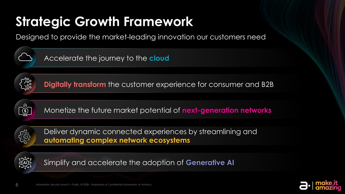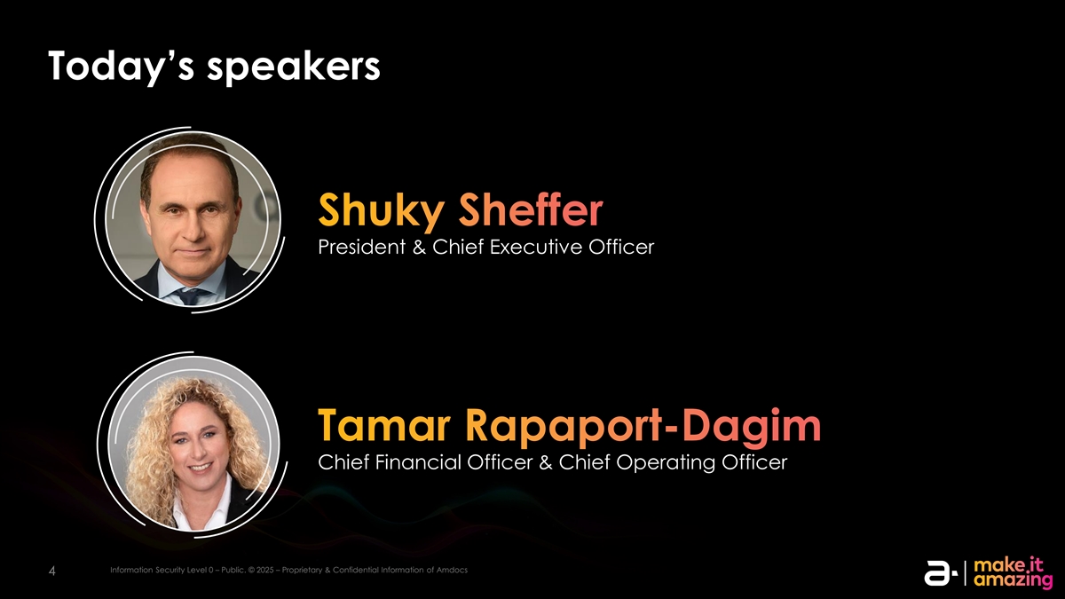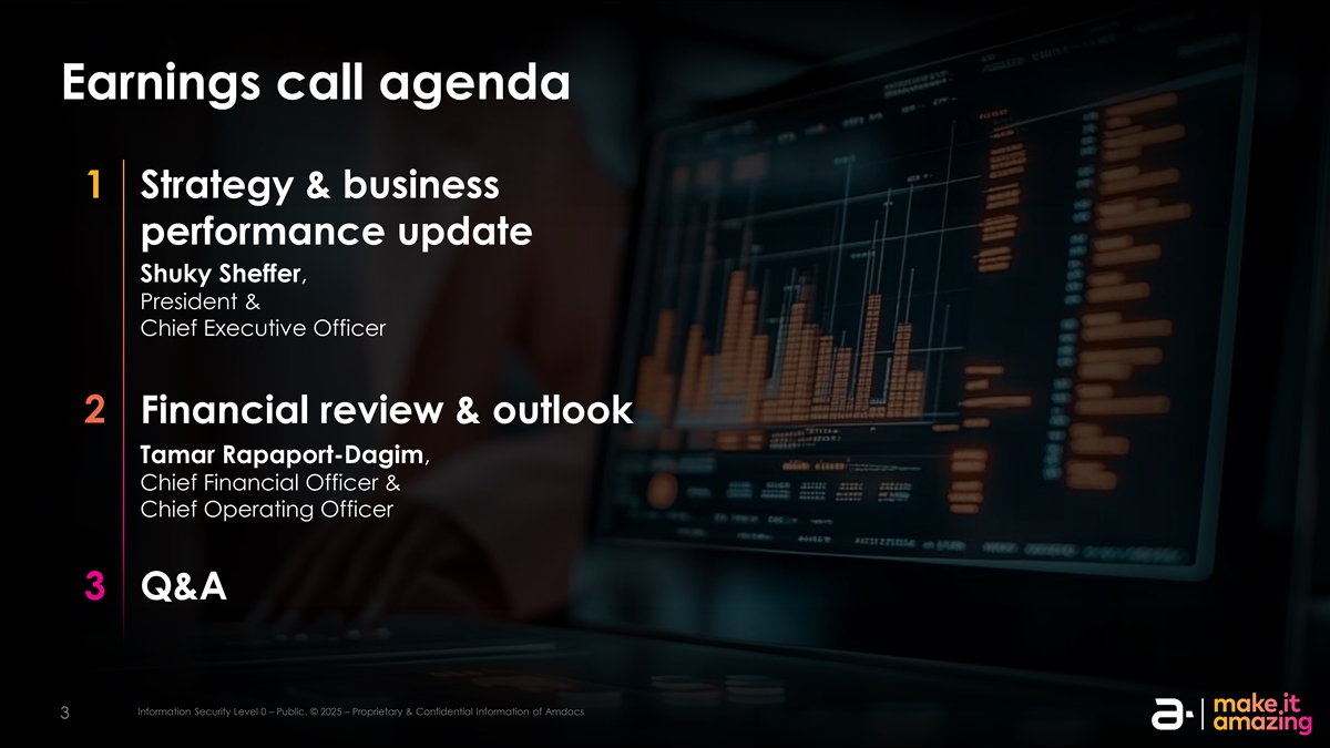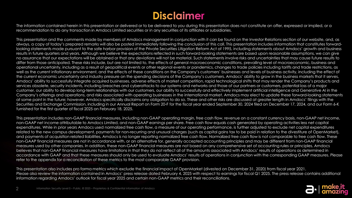 免责声明本演示文稿中包含的或在本演示文稿期间交付或将交付给您的信息并不构成对Amdocs Limited证券或其关联公司或子公司的任何证券进行任何交易的明示或暗示的要约或建议。本演示文稿以及Amdocs管理层成员与其一起发表的评论可在我们网站的投资者关系部分找到,并且与往常一样,今天准备好的评论的副本也将在本次电话会议结束后立即发布。该演示文稿包含的信息构成了根据1995年《私人证券诉讼改革法案》的安全港条款所作的前瞻性陈述,包括有关AmDOCs在未来几个季度和几年的增长和业务结果的陈述。尽管我们认为此类前瞻性陈述中反映的预期是基于合理的假设,但我们不能保证我们的预期会得到实现,或者任何偏差都不会是重大的。此类陈述涉及可能导致未来结果与预期结果不同的风险和不确定性。这些风险包括但不限于一般宏观经济条件、宏观经济普遍水平、商业和运营不确定性的影响,包括地缘政治事件或其他区域事件或流行病的结果、包括关税和贸易限制在内的贸易政策变化,以及当前的通货膨胀环境,以及这些条件对公司客户的业务和商业活动水平的影响,包括当前经济不确定性和行业压力对公司客户的支出决策的影响。AMDOCs在其所服务的业务市场的增长能力、AMDOCs成功整合收购业务的能力、市场竞争的不利影响、可能导致公司产品和服务过时的快速技术转变、安全事件,包括对我们的系统和网络以及我们的合作伙伴或客户的系统和网络的破坏和网络攻击、主要客户的潜在损失、我们与客户发展长期关系的能力、我们在公司产品和运营中成功有效地实施人工智能和生成式人工智能的能力,以及与在国际市场经营业务相关的风险。Amdocs可能会选择在未来某个时候更新这些前瞻性陈述;然而,Amdocs明确表示不承担这样做的任何义务。这些风险和其他风险在AMDOCs提交给美国证券交易委员会的文件中得到了更详细的讨论,包括我们在2024年12月17日提交的截至2024年9月30日的财政年度的20-F表格年度报告,以及我们在2025年2月18日提供的2025财政年度第一季度的6-K表格。该演示文稿包括非GAAP财务指标,包括非GAAP营业利润率、自由现金流、以固定货币为基础的收入、非GAAP净收入、归属于Amdocs Limited的非GAAP净利润以及非GAAP每股收益。自由现金流等于经营活动产生的现金减去净资本支出。虽然在前几年,Amdocs使用了标准化自由现金流,这是衡量我们经营业绩的一个指标,但进一步调整以排除与新校区开发相关的净资本支出、支付非经常性和不寻常的费用(例如与剥离OpenMarket相关的资本利得税)以及支付收购相关负债,Amdocs不再报告标准化自由现金流。正常化的自由现金流不能与自由现金流相比。这些非GAAP财务指标不符合或替代公认会计原则,可能与其他公司使用的非GAAP财务指标不同。此外,这些非美国通用会计准则财务指标并非基于任何一套全面的会计规则或原则。Amdocs认为,非GAAP财务指标存在局限性,因为它们并未反映根据GAAP确定的与Amdocs经营业绩相关的所有金额,这些指标应仅用于结合相应的GAAP指标评估Amdocs的经营业绩。请参阅附录,了解这些指标与最具可比性的GAAP规定的对账情况。该演示文稿还包括不包括OpenMarket(于2020年12月31日剥离)对2021财年的财务影响的备考指标。还请查看AmDOCs 2月4日新闻稿中包含的信息, 与2025财年第一季度收益相关的2025年。新闻稿包含有关AmDOCs对2025财年的展望以及某些非GAAP指标及其对账的更多信息。iIn nf for orm ma at tiion on SE sec cu ur riit ty y l le evel vel 00 –– p pu ub blliic c.。©©20202525 – – P PR rop opr riie et ta ar ry y & & con conf fiid de en nt tiia all iin nf for orm ma at tiion on of a am md doc ocs 22
