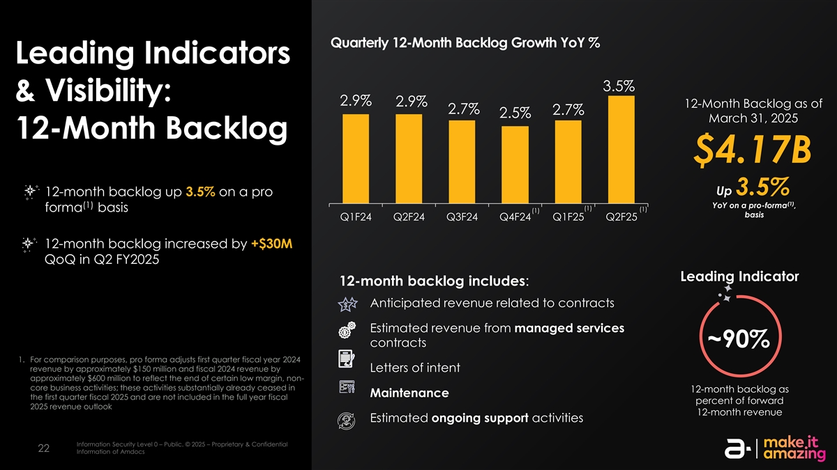 季度12个月积压增长同比%领先指标3.5% &能见度:2.9% 2.9% 12个月积压截至2.7% 2.7% 2.5% 2025年3月31日12个月积压$ 4.17b增长3.5% 12个月积压按备考(1)(1)同比增长3.5%,(1)(1)备考(1)基准Q1F24 Q2F24 Q3F24 Q4F24 Q1F25 Q2F25 12个月积压环比增加+ 3000万美元2025财年第二季度领先指标12个月积压包括:与合同相关的预期收入预计来自托管服务合同的收入~90% 1。为便于比较,备考将2024财年第一季度收入调整约1.5亿美元,通过意向书将2024财年收入调整约6亿美元,以反映某些低利润率、非核心业务活动的结束;这些活动在12个月的积压中基本上已经停止,作为2025财年第一季度的维护,并且不包括在远期2025年收入展望的全年财政百分比中12个月收入估计正在进行的支持活动信息安全等级0–公共。©2025 –专有和机密信息安全等级2 –敏感。©2025 – AmDocs的专有和机密信息2222 AmDocs的信息