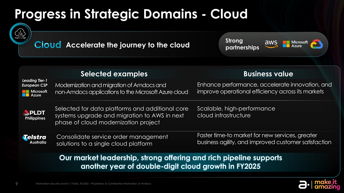战略领域的进展-Cloud Strong加速云之旅Cloud合作伙伴关系精选实例商业价值领先的Tier-1欧洲CSP增强性能、加速创新以及AMDOCs的现代化和迁移,并提高其整个市场的运营效率非AMDOCs应用程序到Microsoft Azure云可扩展、高性能的数据平台和额外核心云基础设施系统升级和迁移到AWS的菲律宾云现代化项目下一阶段更快的新服务上市时间,更好地巩固服务订单管理澳大利亚业务敏捷性,并将客户满意度解决方案提高到单一云平台我们的市场领先地位,强大的产品和丰富的管道支持ORM MA at tiion on SE Sec cu ur riit ty y L Le evel vel 00在2025财年实现又一年两位数的云增长– – P Pu ub blliic c.。©©20202525 – – P PR rop opr riie et ta ar ry y & & & con conf fiid de en nt tiia all iin nf for orm ma at tiion on of a am md doc ocs 99