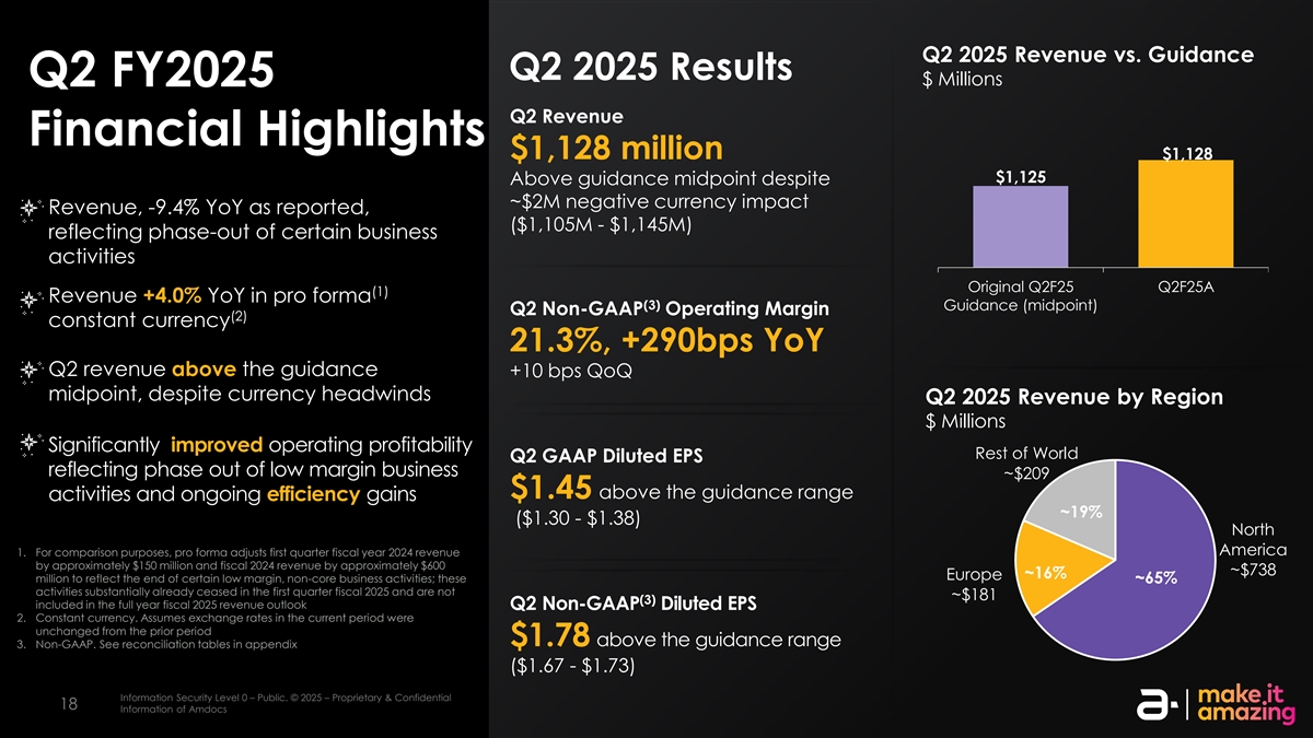 2025年第二季度收入与指引2025年第二季度业绩百万美元2025财年第二季度收入财务亮点11.28亿美元1,128美元高于指引中点1,125美元,尽管受到约200万美元的负面货币影响,收入同比-9.4 %,(11.05亿美元-11.45亿美元)反映了某些业务活动的逐步淘汰原Q2F25 Q2F25A(1)收入同比+ 4.0%(备考(3)指引(中点)Q2非GAAP营业利润率(2)固定汇率21.3%,同比+ 290bps Q2收入高于指引+ 10bps环比中点,尽管存在货币逆风,2025年第二季度按地区划分的收入百万美元显着提高了运营盈利能力世界其他地区第二季度GAAP摊薄后每股收益反映出逐步淘汰低利润率业务约209美元高于指导范围活动1.45美元和持续的效率提升约19%(1.30美元-1.38美元)北1。出于比较目的,备考将2024财年第一季度收入美国约1.5亿美元和2024财年收入约600~738~16%欧洲百万美元进行调整,以反映某些低利润率、非核心业务活动的结束;这些约65%的活动在2025财年第一季度基本上已经停止,并且不包括在2025财年全年收入展望Q2非公认会计准则稀释后每股收益2中的约181(3)美元。不变的货币。假设本期汇率与上一期持平,高于指导区间3的1.78美元。非公认会计原则。见附录中的调节表(1.67-1.73美元)信息安全等级0–公开。©2025 –专有和机密信息安全等级2 –敏感。©2025 – AmDocs的专有和机密信息1818 AmDocs的信息