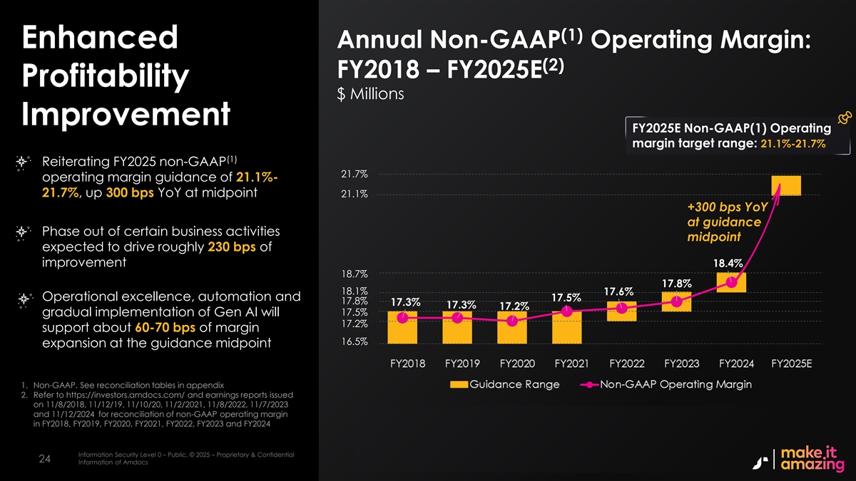 (1)年度非美国通用会计准则营业利润率增强:(2)2018财年– 2025财年盈利能力百万美元改善2025财年非美国通用会计准则(1)营业利润率目标区间:21.1%-21.7 %(1)重申2025财年非美国通用会计准则营业利润率指引为21.1%-21.7 %,在中点21.1%时同比增长300个基点+在指导逐步取消某些业务活动中点时同比增长300个基点,预计将推动大约230个基点的改善18.4% 18.7% 17.8% 18.1% 17.6%卓越运营、自动化和17.5% 17.8% 17.3% 17.3% 17.2% 17.5% Gen AI的逐步实施将支持约60-70个基点的利润率在指导中点1扩大16.5%。非公认会计原则。见附录2中的调节表。有关2018财年、2019财年、2020财年、2021财年、2022财年、2023财年和2024财年非公认会计准则营业利润率的调节,请参阅https://investors.amdocs.com/和发布于2018年11月8日、2019年11月12日、2019年11月10日、2021年11月2日、2022年11月8日、2023年11月7日和2024年11月12日的收益报告以及信息安全等级0–公。©2025 –专有和机密信息安全等级2 –敏感。©2025 – AmDocs的专有和机密信息2424指导范围非GAAP运营利润率信息