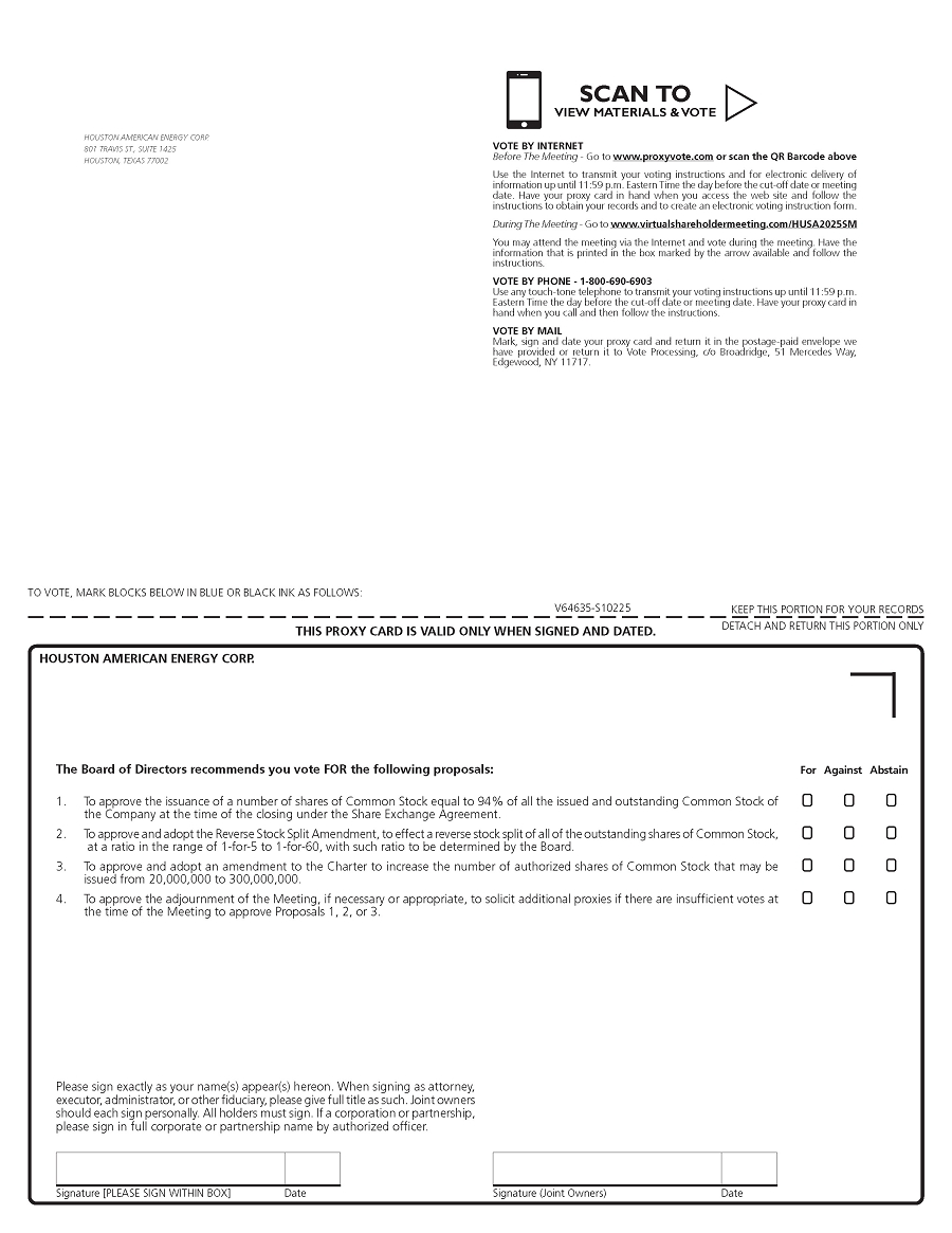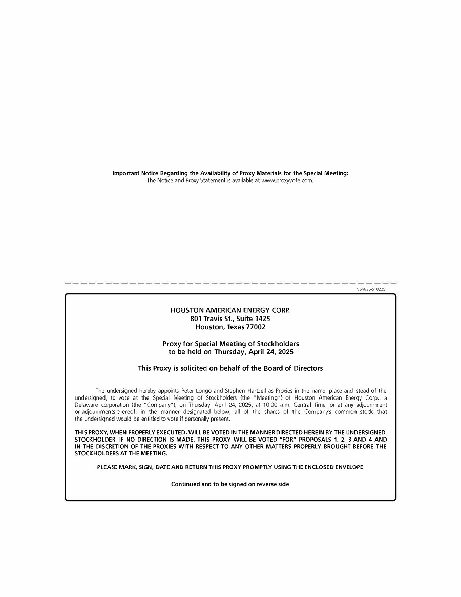 请与我们一起参加将于2025年4月24日美国中部夏令时间上午10:00以虚拟方式召开的Houston American Energy Corp.(“HUSA”或“公司”)特别股东大会(“特别会议”)。不会有实体会议地点。虚拟会议网址为www.virtualshareholdermeeting.com/HUSA2025SM。截至股权登记日的股东可通过访问会议网站并使用其代理卡或投票指示表上的控制号码登录,在线参加会议、投票或提交问题。我们鼓励您加入我们,在线参与。我们建议您在2025年4月24日美国中部夏令时间上午10点前几分钟登录,以确保您在特别会议开始时登录。你将不能亲自出席特别会议。