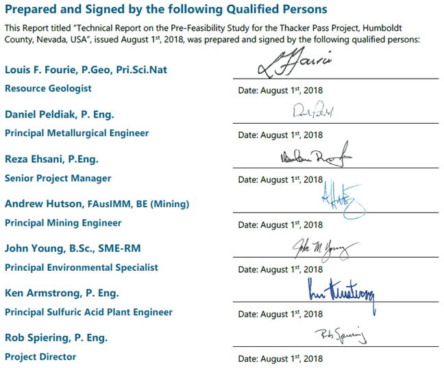 Prepared and Signed by the following Qualified Persons This Report titled “Technical Report on the Pre-Feasibility Study for the Thacker Pass Project, Humboldt County, Nevada, USA”, issued August 1st, 2018, was prepared and signed by the following qualified persons: Louis F. Fourie, P.Geo, Pri.Sci.Nat Resource Geologist Date: August 1st, 2018 Daniel Peldiak, P. Eng. Principal Metallurgical Engineer Date: August 1st, 2018 Reza Ehsani, P.Eng. Senior Project Manager Andrew Hutson, FAusIMM, BE (Mining) Principal Mining Engineer Date: August 1st, 2018 Date: August 1st, 2018 John Young, B.Sc., SME-RM Principal Environmental Specialist Date: August 1st, 2018 Ken Armstrong, P. Eng. Principal Sulfuric Acid Plant Engineer Rob Spiering, P. Eng. Project Director Date: August 1st, 2018