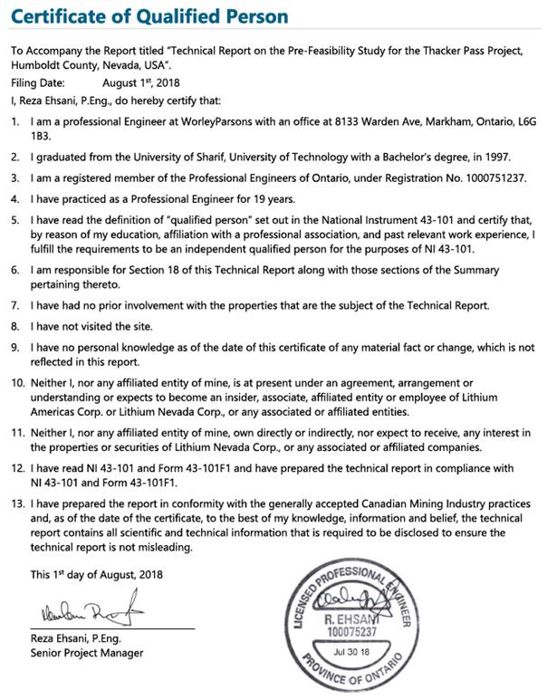 Certificate of Qualified Person To Accompany the Report titled “Technical Report on the Pre-Feasibility Study for the Thacker Pass Project, Humboldt County, Nevada, USA”. Filing Date: August 1st, 2018 I, Reza Ehsani, P.Eng., do hereby certify that: 1.I am a professional Engineer at WorleyParsons with an office at 8133 Warden Ave, Markham, Ontario, L6G 1B3. 2. I graduated from the University of Sharif, University of Technology with a Bachelor’s degree, in 1997. 3. I am a registered member of the Professional Engineers of Ontario, under Registration No. 1000751237. 4. I have practiced as a Professional Engineer for 19 years. 5. I have read the definition of “qualified person” set out in the National Instrument 43-101 and certify that, by reason of my education, affiliation with a professional association, and past relevant work experience, I fulfill the requirements to be an independent qualified person for the purposes of NI 43-101. 6. I am responsible for Section 18 of this Technical Report along with those sections of the Summary pertaining thereto. 7. I have had no prior involvement with the properties that are the subject of the Technical Report. 8. I have not visited the site. 9. I have no personal knowledge as of the date of this certificate of any material fact or change, which is not reflected in this report. 10. Neither I, nor any affiliated entity of mine, is at present under an agreement, arrangement or understanding or expects to become an insider, associate, affiliated entity or employee of Lithium Americas Corp. or Lithium Nevada Corp., or any associated or affiliated entities. 11. Neither I, nor any affiliated entity of mine, own directly or indirectly, nor expect to receive, any interest in the properties or securities of Lithium Nevada Corp., or any associated or affiliated companies. 12. I have read NI 43-101 and Form 43-101F1 and have prepared the technical report in compliance with NI 43-101 and Form 43-101F1. 13. I have prepared the report in conformity with the generally accepted Canadian Mining Industry practices and, as of the date of the certificate, to the best of my knowledge, information and belief, the technical report contains all scientific and technical information that is required to be disclosed to ensure the technical report is not misleading. This 1st day of August, 2018 Reza Ehsani, P.Eng. Senior Project Manager