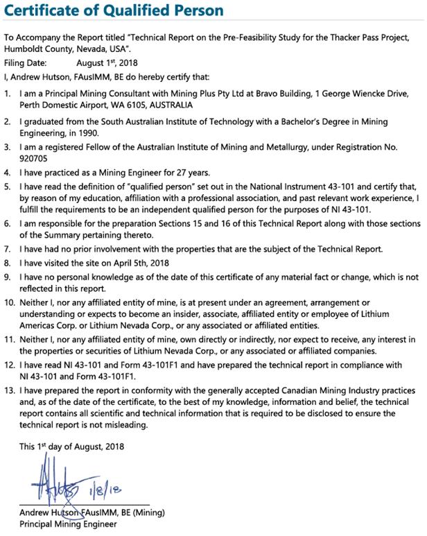 Certificate of Qualified Person To Accompany the Report titled “Technical Report on the Pre-Feasibility Study for the Thacker Pass Project, Humboldt County, Nevada, USA”. Filing Date: August 1st, 2018 I, Andrew Hutson, FAusIMM, BE do hereby certify that: 1. I am a Principal Mining Consultant with Mining Plus Pty Ltd at Bravo Building, 1 George Wiencke Drive, Perth Domestic Airport, WA 6105, AUSTRALIA 2. I graduated from the South Australian Institute of Technology with a Bachelor’s Degree in Mining Engineering, in 1990. 3. I am a registered Fellow of the Australian Institute of Mining and Metallurgy, under Registration No. 920705 4. I have practiced as a Mining Engineer for 27 years. 5. I have read the definition of “qualified person” set out in the National Instrument 43-101 and certify that, by reason of my education, affiliation with a professional association, and past relevant work experience, I fulfill the requirements to be an independent qualified person for the purposes of NI 43-101. 6. I am responsible for the preparation Sections 15 and 16 of this Technical Report along with those sections of the Summary pertaining thereto. 7. I have had no prior involvement with the properties that are the subject of the Technical Report. 8. I have visited the site on April 5th, 2018 9. I have no personal knowledge as of the date of this certificate of any material fact or change, which is not reflected in this report. 10. Neither I, nor any affiliated entity of mine, is at present under an agreement, arrangement or understanding or expects to become an insider, associate, affiliated entity or employee of Lithium Americas Corp. or Lithium Nevada Corp., or any associated or affiliated entities. 11. Neither I, nor any affiliated entity of mine, own directly or indirectly, nor expect to receive, any interest in the properties or securities of Lithium Nevada Corp., or any associated or affiliated companies. 12. I have read NI 43-101 and Form 43-101F1 and have prepared the technical report in compliance with NI 43-101 and Form 43-101F1. 13. I have prepared the report in conformity with the generally accepted Canadian Mining Industry practices and, as of the date of the certificate, to the best of my knowledge, information and belief, the technical report contains all scientific and technical information that is required to be disclosed to ensure the technical report is not misleading. This 1st day of August, 2018 Andrew Hutson FAusIMM, BE (Mining) Principal Mining Engineer