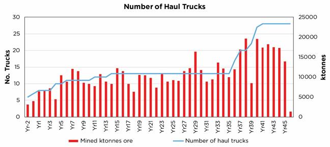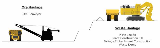 Ore Overland Conveyor – It is recommended that a tradeoff study be completed for the overland ore conveyor vs. truck haulage. The haul route is relatively flat and the cost for additional trucks could potentially be less than the cost for the conveyor, although the operating cost of truck is significantly higher. |