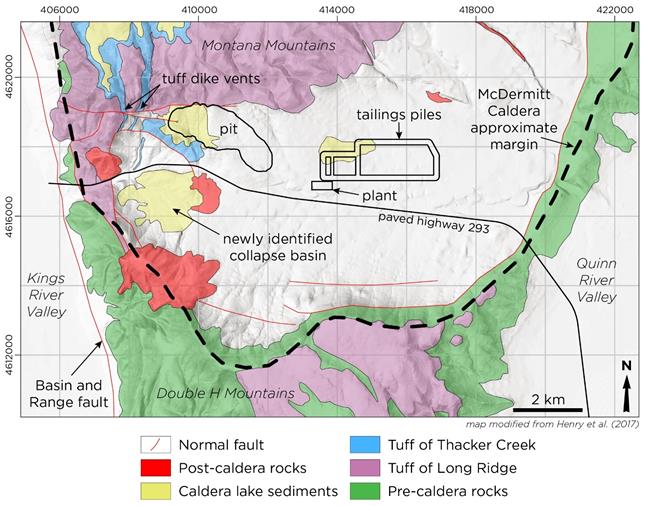 Henry, C.D., Castor, S.B., Starkel, W.A., Ellis, B.S., Wolff, J.A., Laravie, J.A., and Heizler, M.T. (2017). Geology and Evoluion of the McDermitt Caldera, Northern Nevada and Southeastern Oregon, Western USA. Geosphere, 13(4), 1–47. https://doi.org/10.1130/GES01454.1.
