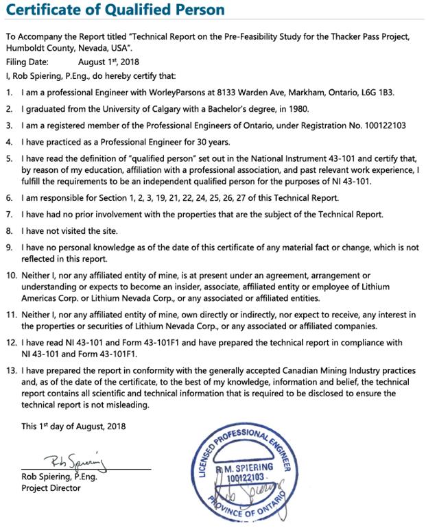 Certificate of Qualified Person To Accompany the Report titled “Technical Report on the Pre-Feasibility Study for the Thacker Pass Project, Humboldt County, Nevada, USA”. Filing Date: August 1st, 2018 I, Rob Spiering, P.Eng., do hereby certify that: 1. I am a professional Engineer with WorleyParsons at 8133 Warden Ave, Markham, Ontario, L6G 1B3. 2. I graduated from the University of Calgary with a Bachelor’s degree, in 1980. 3. I am a registered member of the Professional Engineers of Ontario, under Registration No. 100122103 4. I have practiced as a Professional Engineer for 30 years. 5. I have read the definition of “qualified person” set out in the National Instrument 43-101 and certify that, by reason of my education, affiliation with a professional association, and past relevant work experience, I fulfill the requirements to be an independent qualified person for the purposes of NI 43-101. 6. I am responsible for Section 1, 2, 3, 19, 21, 22, 24, 25, 26, 27 of this Technical Report. 7. I have had no prior involvement with the properties that are the subject of the Technical Report. 8. I have not visited the site. 9. I have no personal knowledge as of the date of this certificate of any material fact or change, which is not reflected in this report. 10. Neither I, nor any affiliated entity of mine, is at present under an agreement, arrangement or understanding or expects to become an insider, associate, affiliated entity or employee of Lithium Americas Corp. or Lithium Nevada Corp., or any associated or affiliated entities. 11. Neither I, nor any affiliated entity of mine, own directly or indirectly, nor expect to receive, any interest in the properties or securities of Lithium Nevada Corp., or any associated or affiliated companies. 12. I have read NI 43-101 and Form 43-101F1 and have prepared the technical report in compliance with NI 43-101 and Form 43-101F1. 13. I have prepared the report in conformity with the generally accepted Canadian Mining Industry practices and, as of the date of the certificate, to the best of my knowledge, information and belief, the technical report contains all scientific and technical information that is required to be disclosed to ensure the technical report is not misleading. This 1st day of August, 2018 Rob Spiering, P.Eng. Project Director