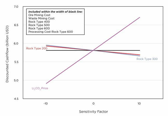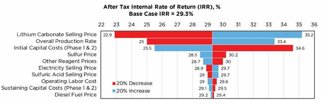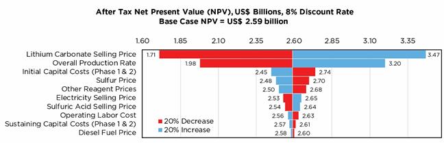 The analysis demonstrated high sensitivity to lithium carbonate price, overall plant production, initial capital costs, and the cost of sulfur and other reagents. The project is relatively insensitive to changes in electricity or diesel fuel prices, or to sustaining capital costs.