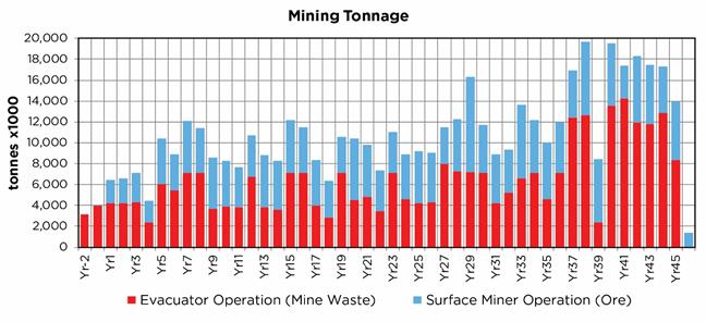 Excavator vs Surface Miner – It is recommended that as future rock mechanics and moisture testwork is completed, a detailed tradeoff study between an excavator and a surface miner is completed for mining the ore material. Although the excavator has known issues with claystone materials, Mine Plus feels the potential productivity of an excavator warrants a comparison to the planned surface miner. |