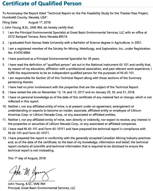 Certificate of Qualified Person To Accompany the Report titled “Technical Report on the Pre-Feasibility Study for the Thacker Pass Project, Humboldt County, Nevada, USA”. Filing Date: August 1st, 2018 I, John Young, B.Sc., SME-RM, do hereby certify that: 1. I am the Principal Environmental Specialist at Great Basin Environmental Services, LLC with an office at 2572 Rampart Terrace, Reno Nevada 89519. 2. I graduated from Kansas State University with a Bachelor of Science degree in Agriculture, in 2001. 3. I am a registered member of the Society for Mining, Metallurgy, and Exploration, Inc., under Registration No. 4147616RM. 4. I have practiced as a Principal Environmental Specialist for 39 years. 5. I have read the definition of “qualified person” set out in the National Instrument 43-101 and certify that, by reason of my education, affiliation with a professional association, and past relevant work experience, I fulfill the requirements to be an independent qualified person for the purposes of NI 43-101. 6. I am responsible for Section 20 of this Technical Report along with those sections of the Summary pertaining thereto. 7. I have had no prior involvement with the properties that are the subject of the Technical Report. 8. I have visited the site on November 13, 14, and 15, 2017 and on January 29, 30, and 31, 2018. 9. I have no personal knowledge as of the date of this certificate of any material fact or change, which is not reflected in this report. 10. Neither I, nor any affiliated entity of mine, is at present under an agreement, arrangement or understanding or expects to become an insider, associate, affiliated entity or employee of Lithium Americas Corp. or Lithium Nevada Corp., or any associated or affiliated entities. 11. Neither I, nor any affiliated entity of mine, own directly or indirectly, nor expect to receive, any interest in the properties or securities of Lithium Nevada Corp., or any associated or affiliated companies. 12. I have read NI 43-101 and Form 43-101F1 and have prepared the technical report in compliance with NI 43-101 and Form 43-101F1. 13. I have prepared the report in conformity with the generally accepted Canadian Mining Industry practices and, as of the date of the certificate, to the best of my knowledge, information and belief, the technical report contains all scientific and technical information that is required to be disclosed to ensure the technical report is not misleading. This 1st day of August, 2018 John Young, B.Sc., SME-RM Principal, Great Basin Environmental Services, LLC